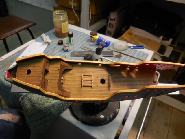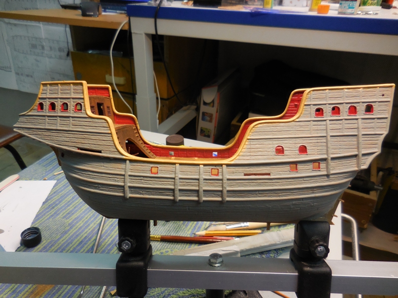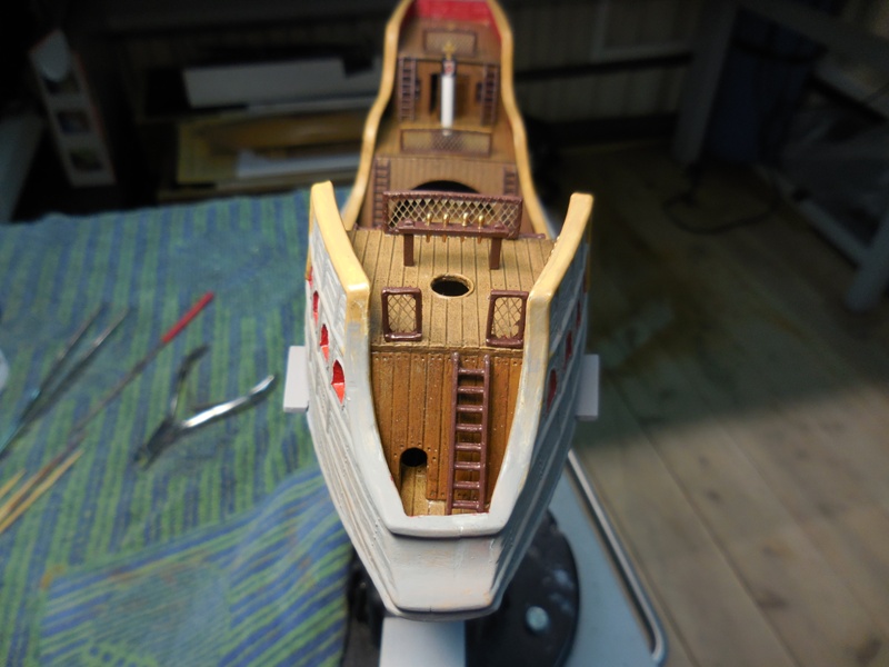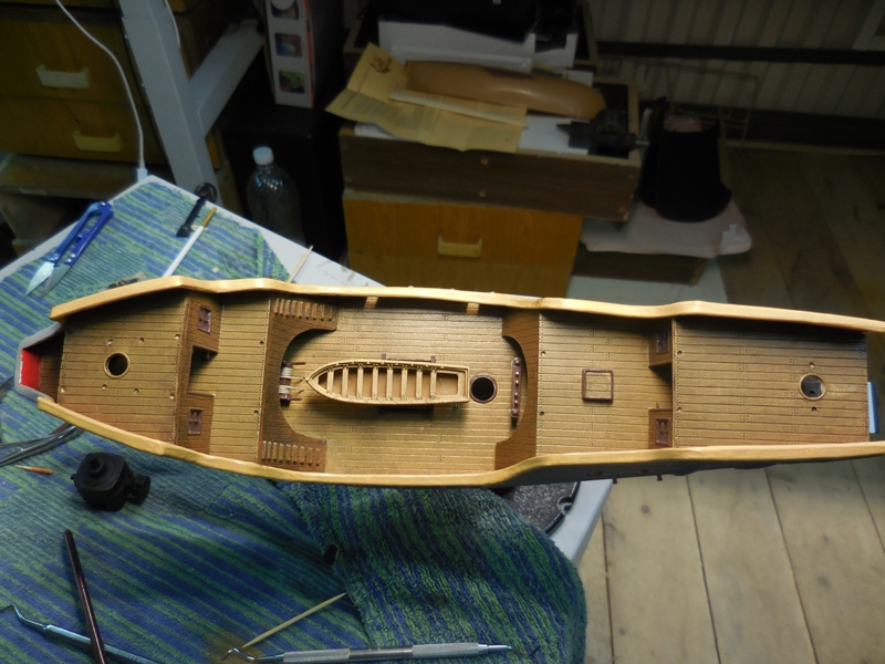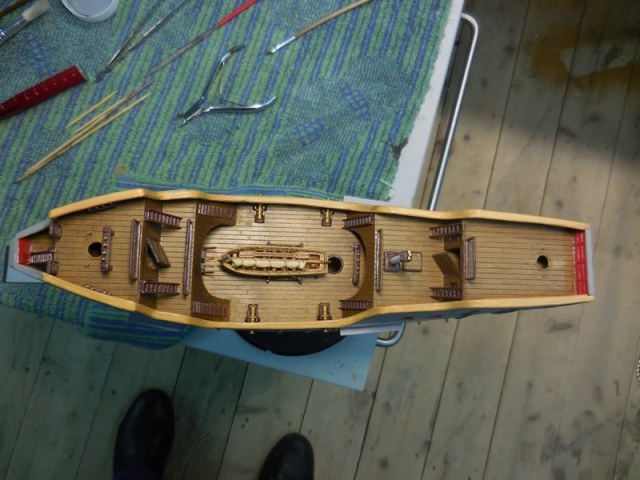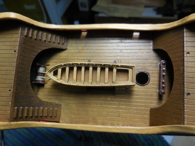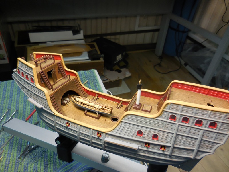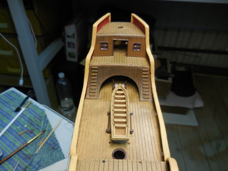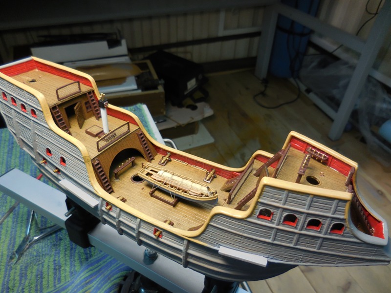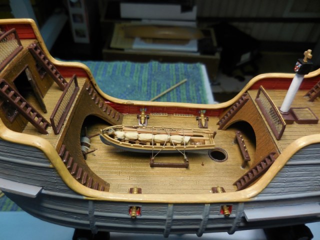 Ну и конечно же разрешаю вносить Даше в модель своё видение. Сейчас она решила, чтобы корпуса шлюпок будут серо-синие, а стволы пушек бронзовые.