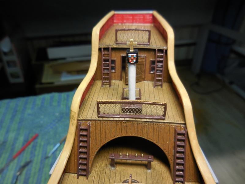 Продолжаем с Дашечкой собирать сувенир "ЛГ". Больших трудностей пока не возникало. Корма и руль встали на место практически без подгонки. Немножко, по желанию и предложениям Даши, дорабатываем модель. Установили дополнительно шесть пушек, и шлюпку заменили другой, взяли из старых запасов от Звездинской Виктории (набор приобретённый был бракованный). Парус на шлюпку делала дочь. Установили корабельный крест. В инструкции по сборке его нет, а в литниках есть, вот дочь и захотела его установить. Сама покрасила и выбрала место для установки. Ну и ещё ряд доработок, на фотках их видно.