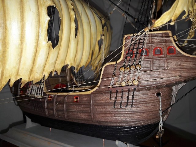 Для будущего проекта попытаюсь найти нить диаметром 0,1 - 0,12, ну или сам попытаюсь смотать на тросомоте, правда нужно будет заказать исходную нить потоньше имеющейся. В любом случае выбленки толще делать чем 0,12 не стоит. Я даже, если честно, открыл одну из фоток реальной Виктори, и прямо на экране компьютера штангелем замерял ванту и выбленок - разница примерно в 10 - 12 раз, следовательно выбленки на Виктори примерно 10 мм в диаметре.