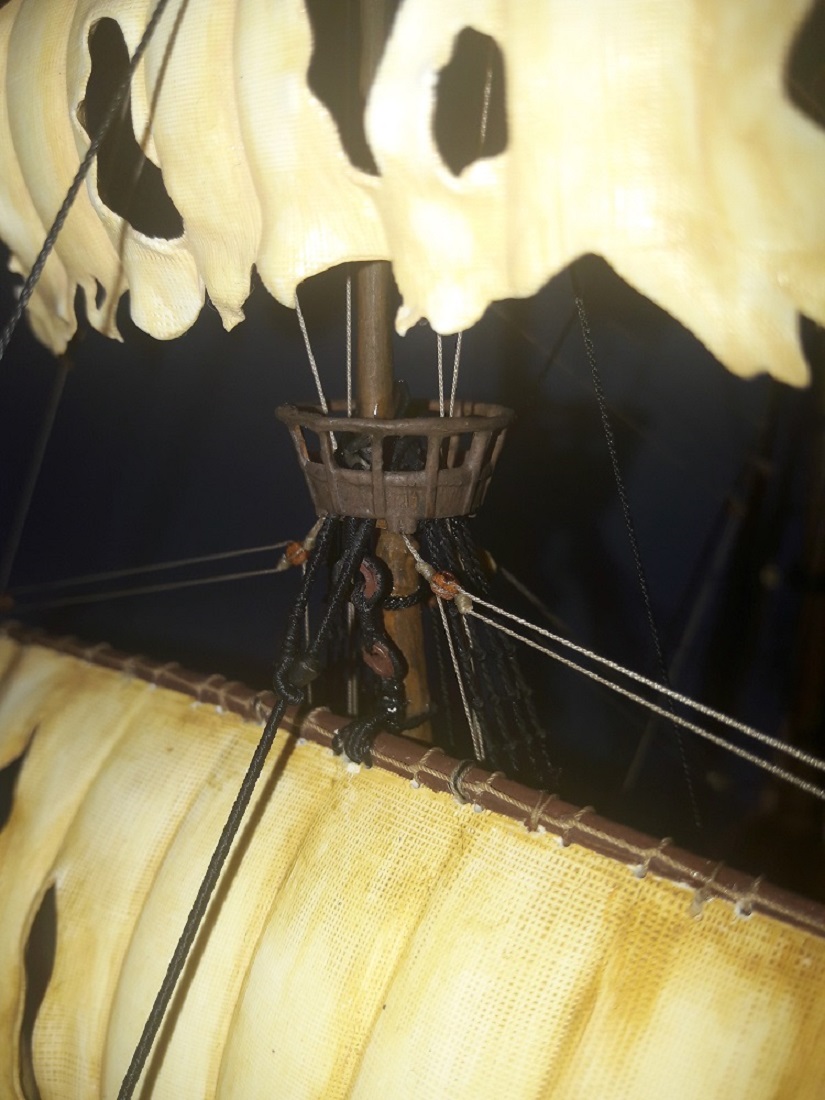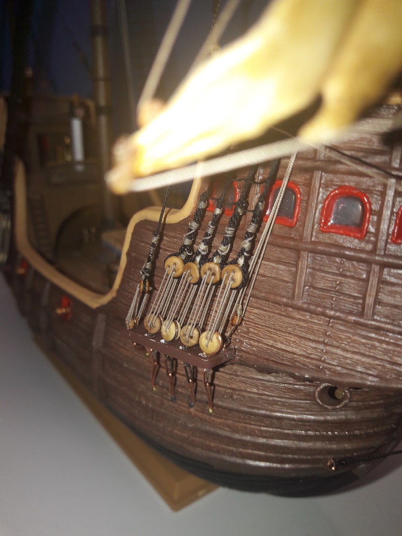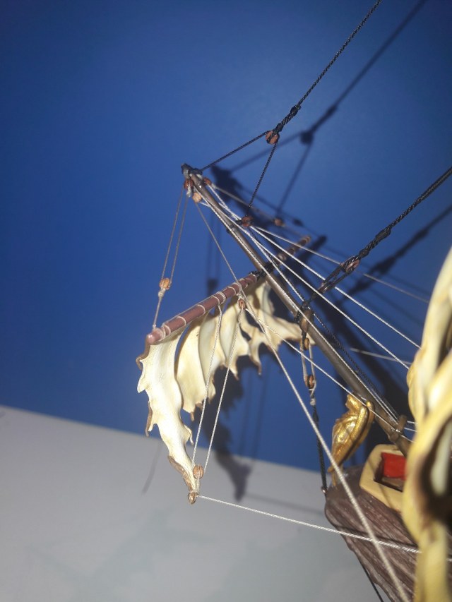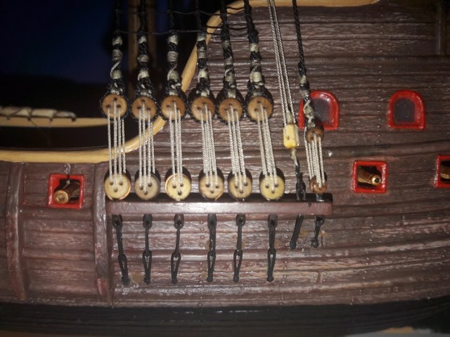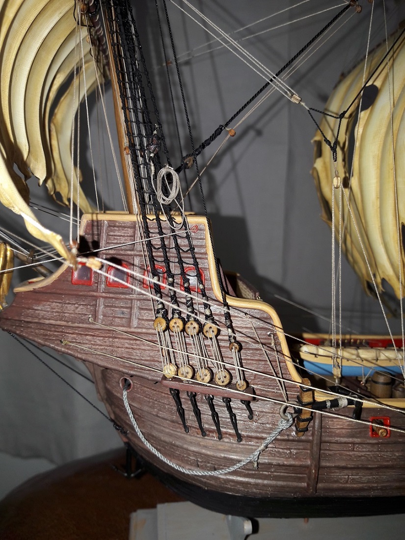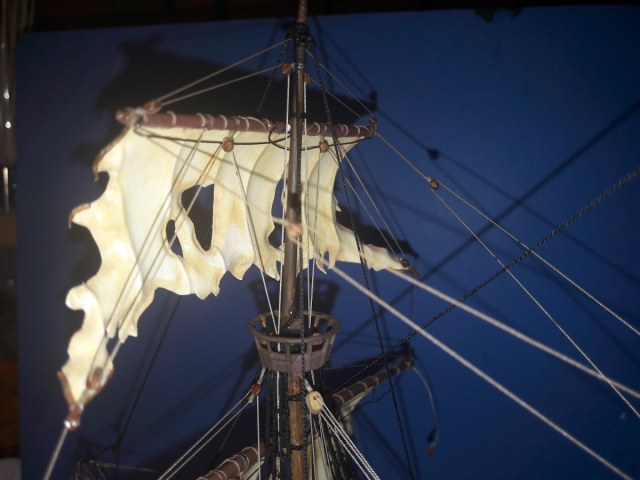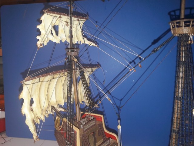 ...или может какой то визуальный эффект... если сравнивать с фото реального корабля, то такое впечатление,что на модели выбленочные узлы слишком крупные...хотя когда фотку вант модели рассматриваешь - вроде нить для выбленок достаточно тонкая...