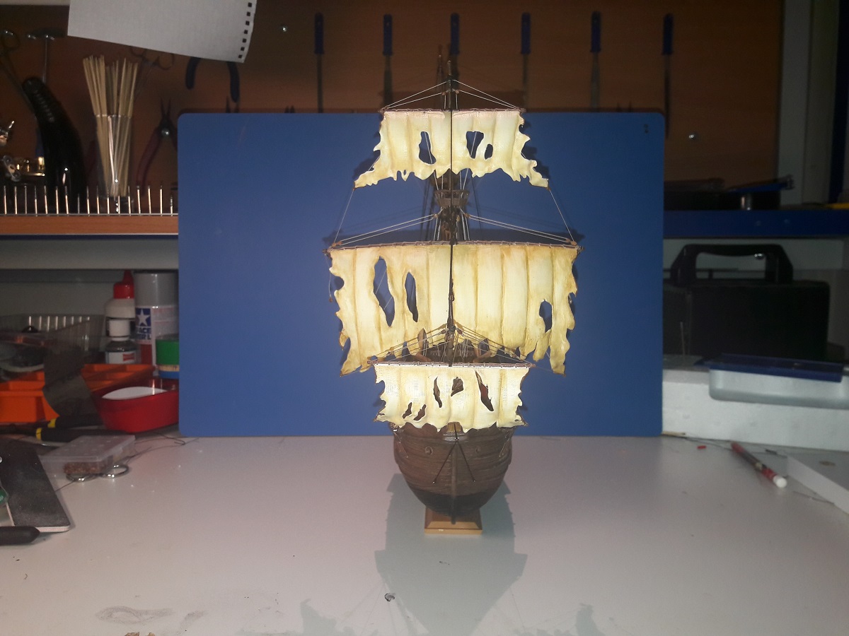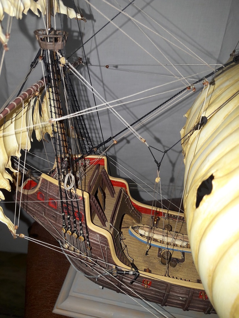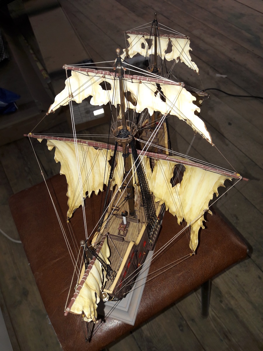 Теперь о парусах. Эту модель мы собираем вместе с дочуркой и для неё. С учетом того, что уже получается, само напрашивается - пошить нормальные паруса (пусть даже рваные потом будут, но из ткани), а пластик дубовый в утиль. Но...! К парусам из набора я практически не прикасался. Всё делала Даша: зачищала и шлифовала, где нужно, придумывала как покрасить и затем покрасила, самостоятельно "пришила" паруса к реям (я балдею от этого её термина), выбрав именно этот способ "пришивания" из приведённых в книге. Даже отверстия для "пришивания" сверлила сама. Вот поэтому и не поворачивается у меня язык, сказать о замене парусов. Ну а когда обсуждали с Дашей, что же это у нас получается, то решили, что это будет инопланетный парусный корабль, а дырки в парусах - это их навигационные приборы. Так что от "ЛГ" мы ушли, к более-менее реальному паруснику мы не придем, зато вместе и с азартом.