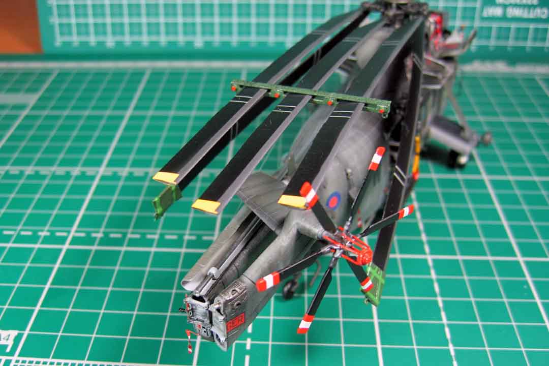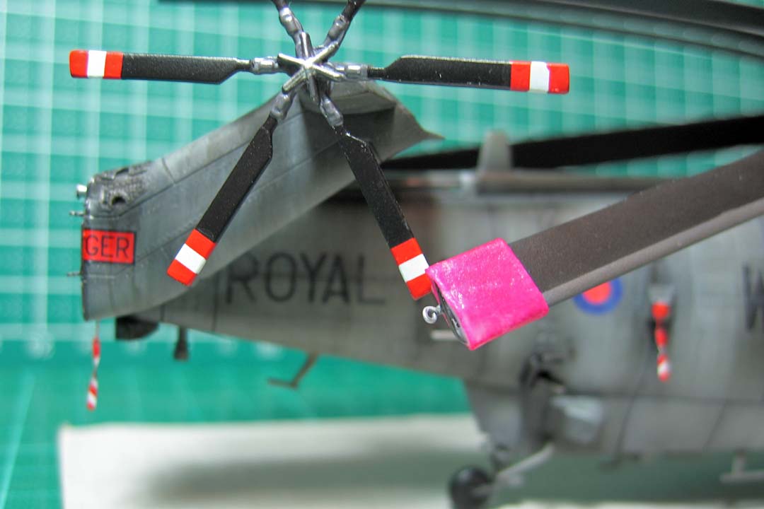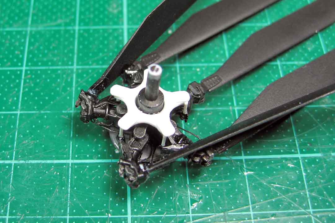 Нанёс декали на лопасти, задул втулку винта металликом, покрасил чехлы на лопастях, покрасил и приклеил стопор заднего винта