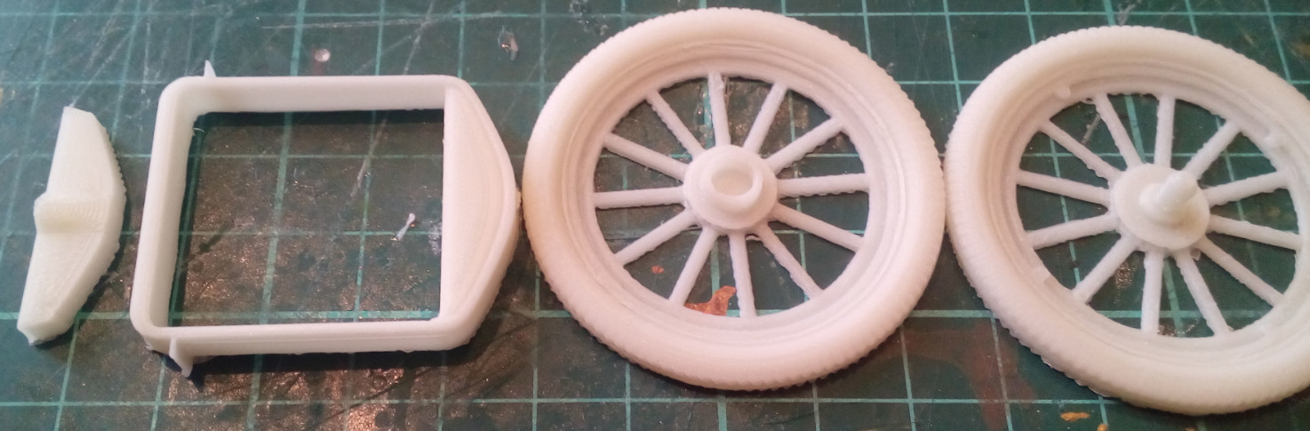 Попечатал еще немного деталей: раму, колесо и кожух радиатора. Раму пришлось резать на 6 частей. Получилась она откровенно хлипкой. Думаю даже, не сделать ли боковые накладки из жести. Хотя раме может придать жесткости двигатель и корпус. Колесо печатал двумя деталями. Обрабатывать нужно много. Шпакли уйдет тоже немало скорее всего.
