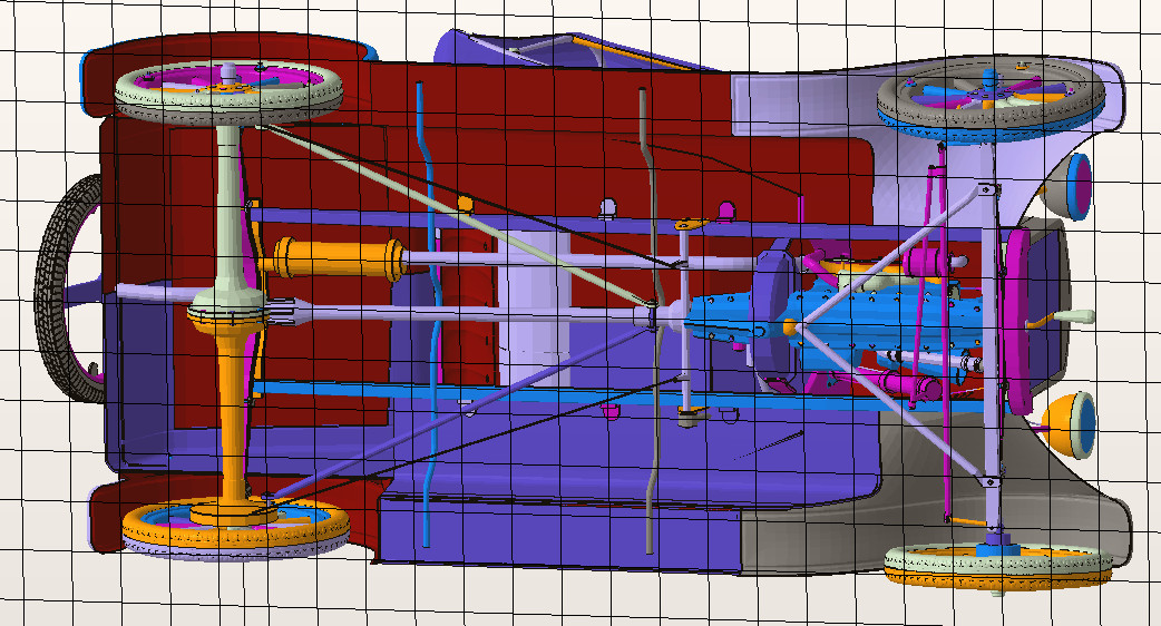 А что гораздо хуже (хотя этого следовало ожидать т.к. модели созданы разными авторами) взять раму и подкапотное пространство от грузовичка и водрузить на него "скорлупку" и крылья родстера не получиться - все линейные размеры разные (межосевое расстояние, расстояние между лонжеронами рамы, места креплений, размеры радиатора и тд и тп).