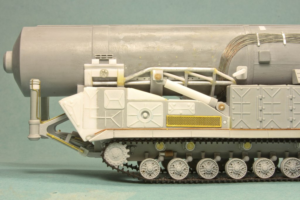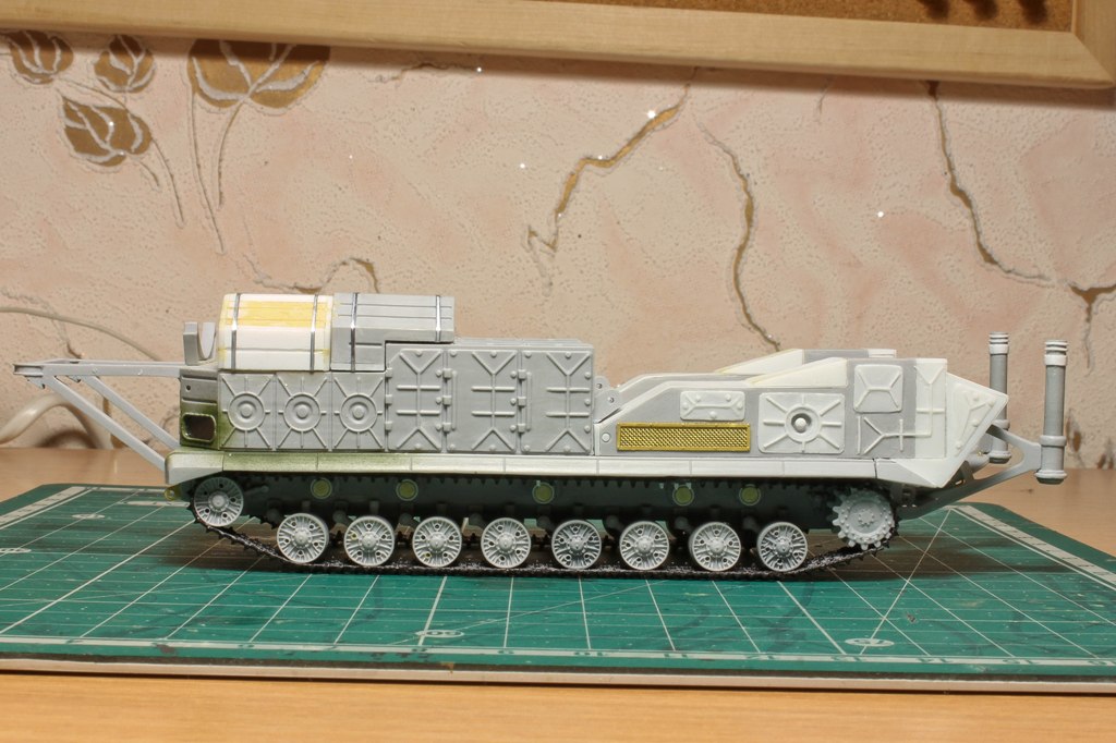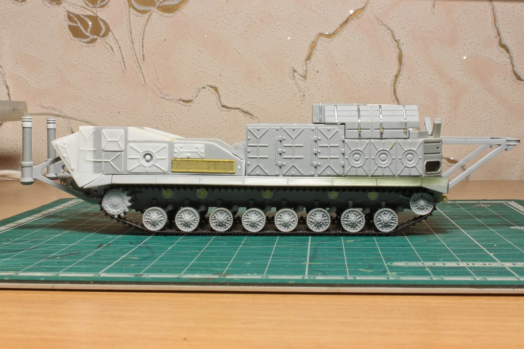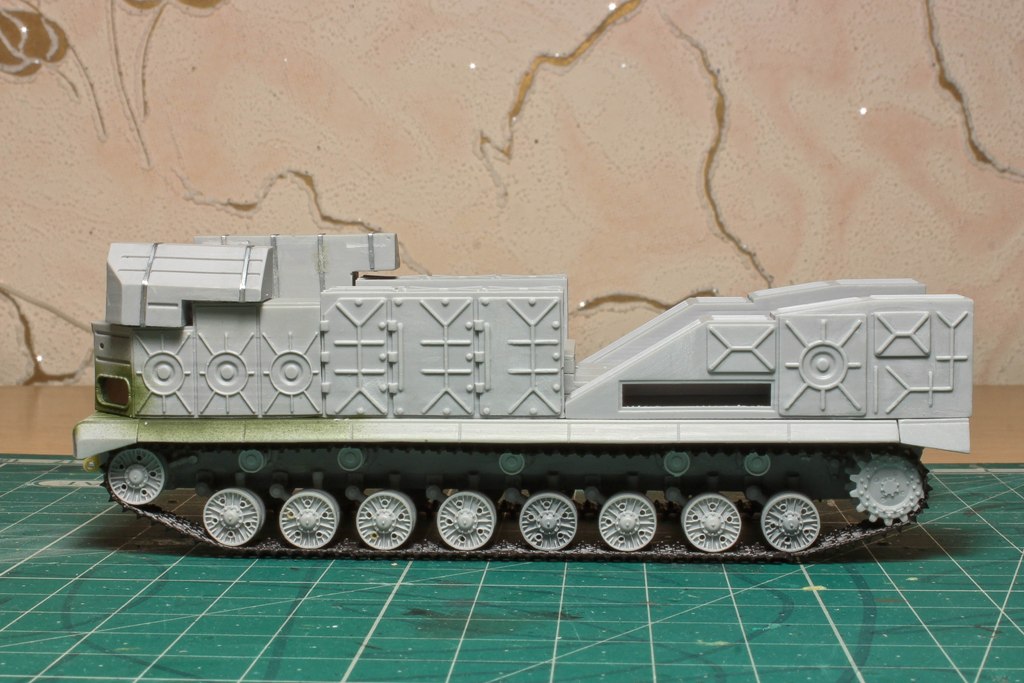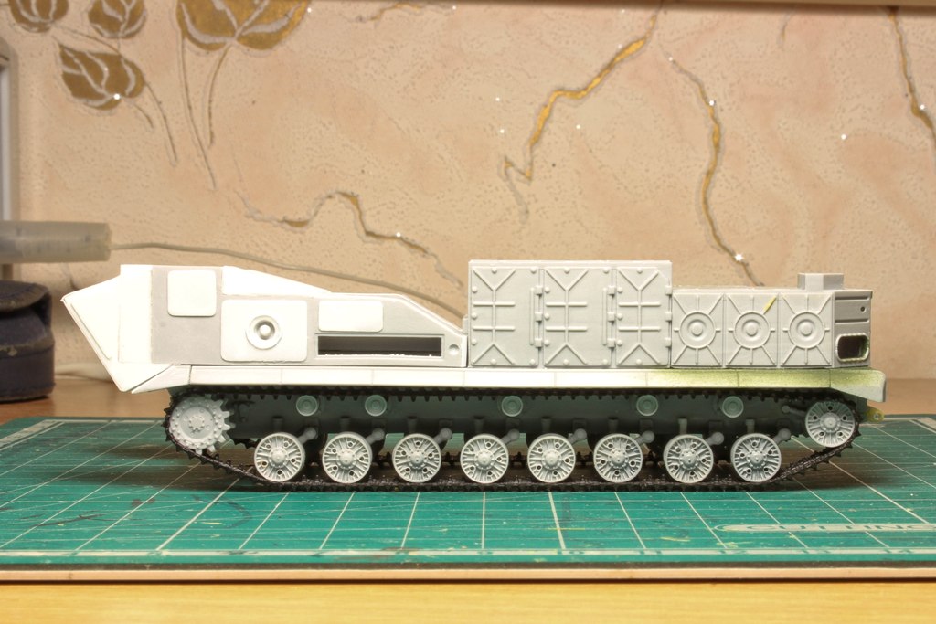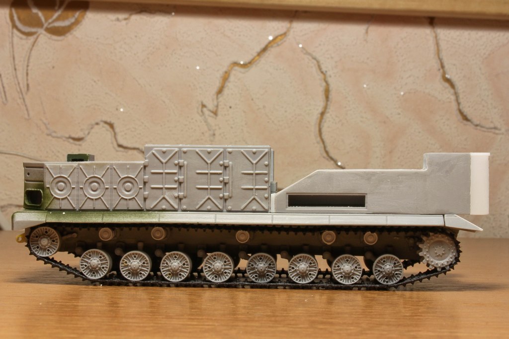 По фото "в профиль" вижу, что ходовую придется еще редактировать. У модели расстояние между 2-м и 3-м рычагом больше, чем другие. В итоге, 2-й и 3-й каток разделяет бОльшее расстояние, чем все остальные катки. Так же, судя по фото с парада, звездочка должны быть ближе к каткам...