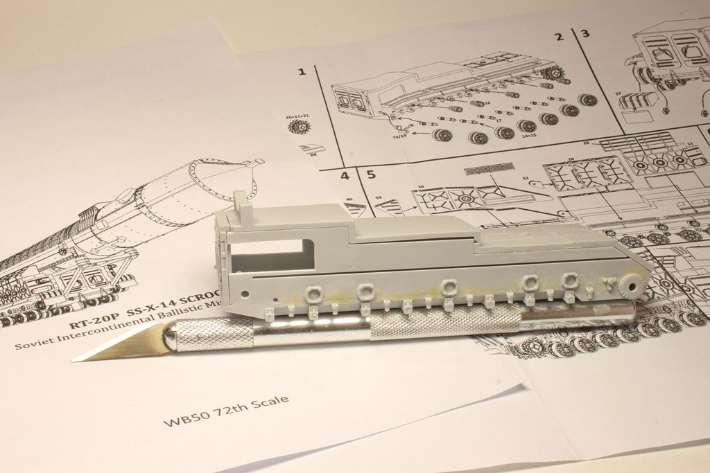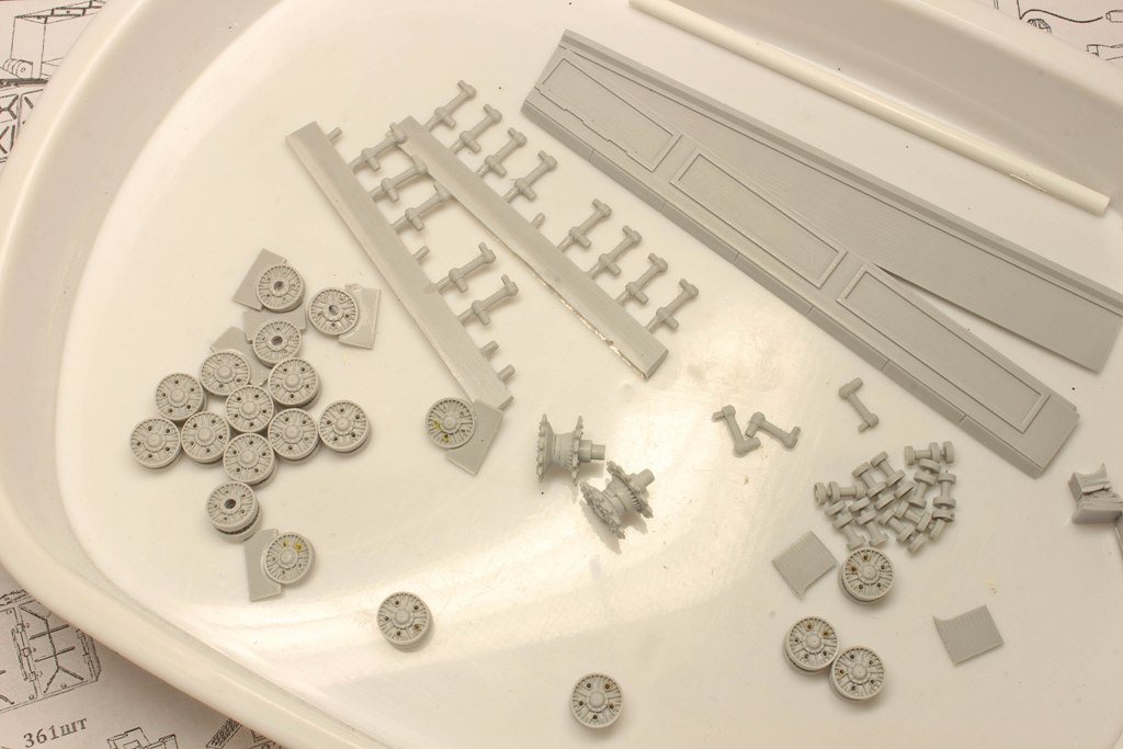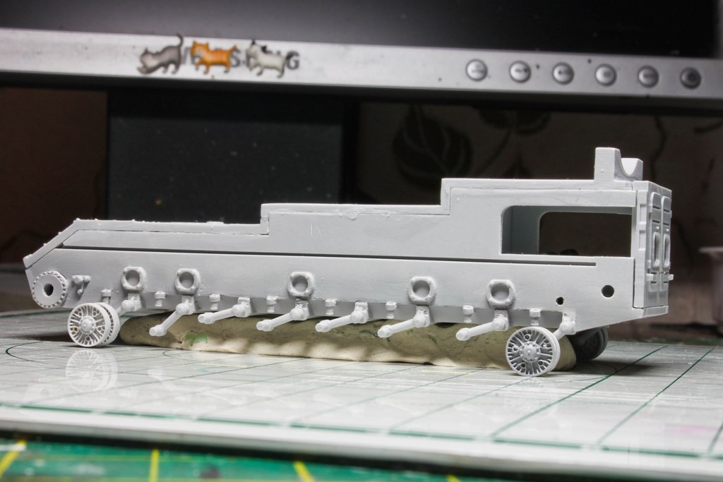 На данный момент подсобрана ванна корпуса, по большей части обработаны катки ходовой. Многие катки по форме больше похожи на овал, чем на круг, у не которых пришлось дорабатывать капелькой двухкомпонентки отверстия. В целом, смола довольно мягкая в обработке, замыленностей и прочих дефектов почти нет.