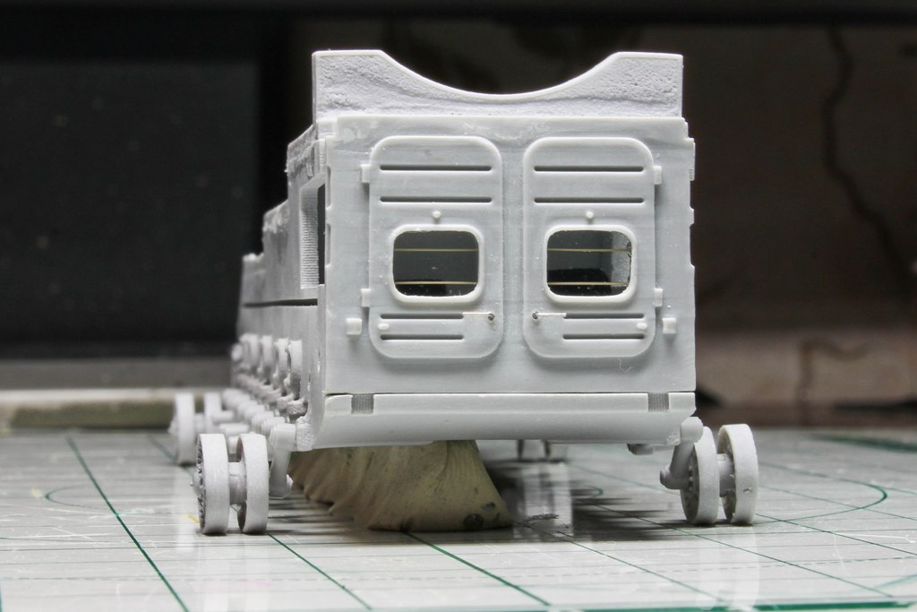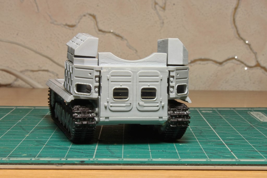 Итак, сегодняшний результат: добавил стекла, решетки за них, дверные ручки из струны. Поставил на модель "на ноги", одел гусеницы. Отверстия под рычаги залиты наглухо))