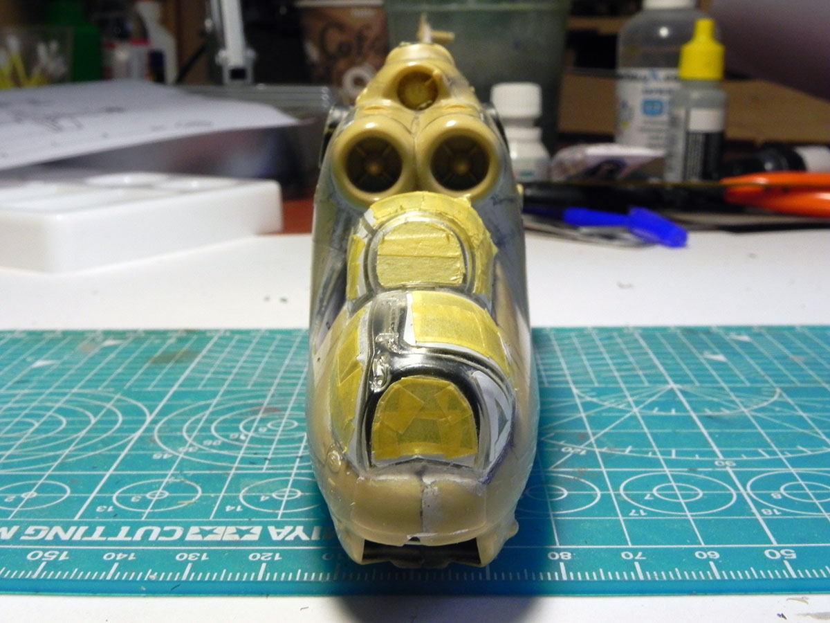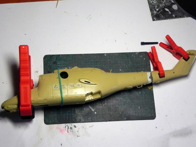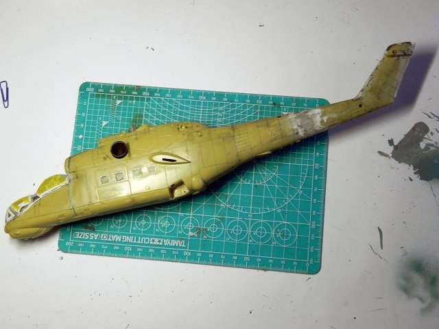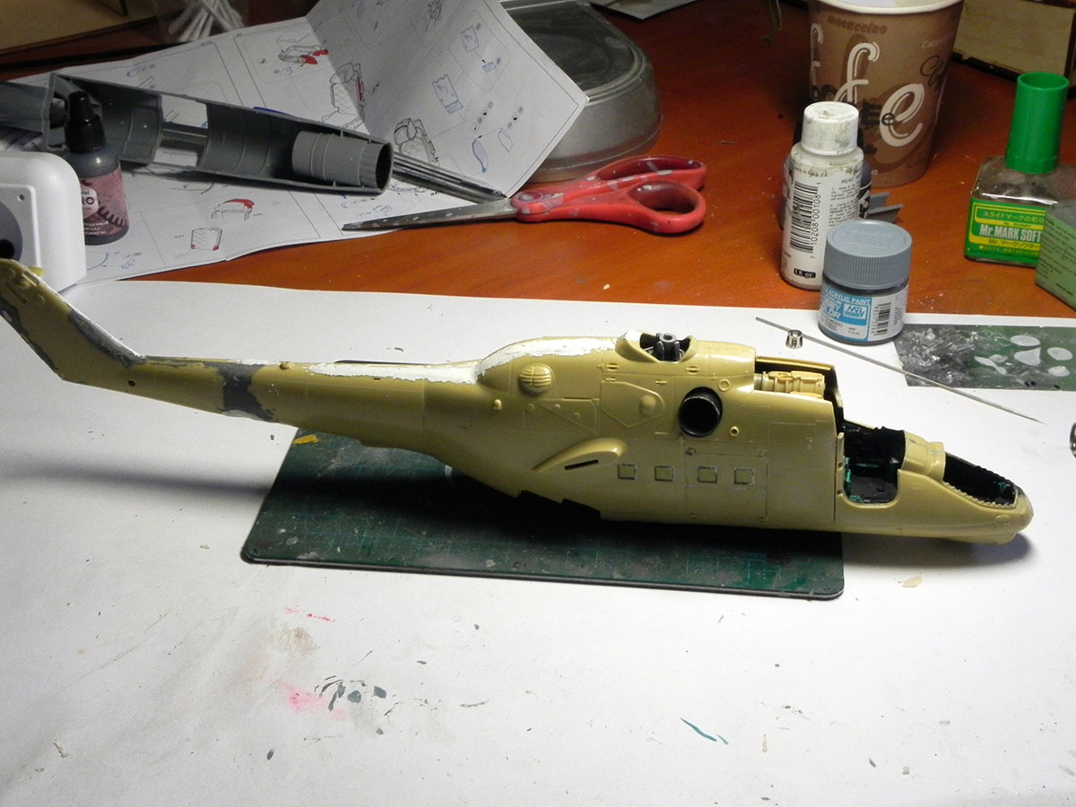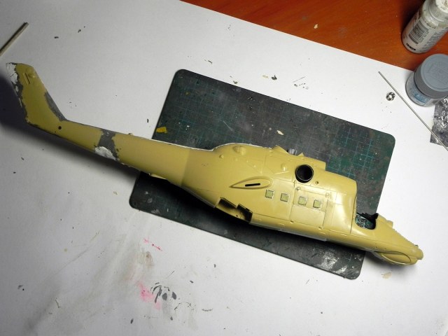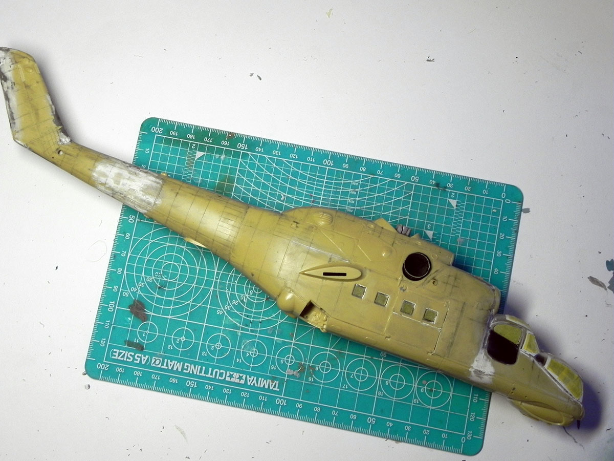 Если сравнивать с чертежами, и фото ,то по-хорошему "это" надо пилить вдоль и поперек, фюзеляж в ширину и высоту -больше чем надо, борты носовой секции фюзеляжа "завалены", хвостовая балка -короче чем надо , крылья (консоли) чуть-ли не 1.5 раза больше в размахе чем надо, я уже не говорю про "мелочевку" -вроде большего в размере и не правильного по геометрии стабилизатора, в общем у Монограмма получился этакий "головастик" ,что не удивительно, модель делалась на глазок, по фото....Наклон оси несущего винта? Так кажется -вся центральная секция фюзеляжа должна быть ассиметрична.