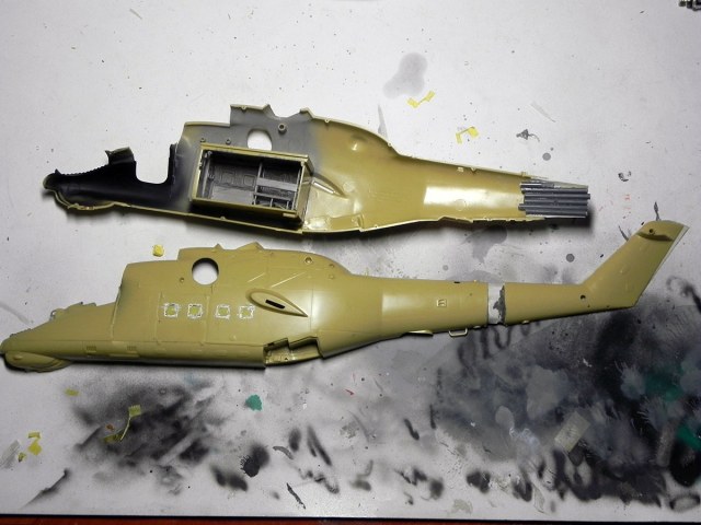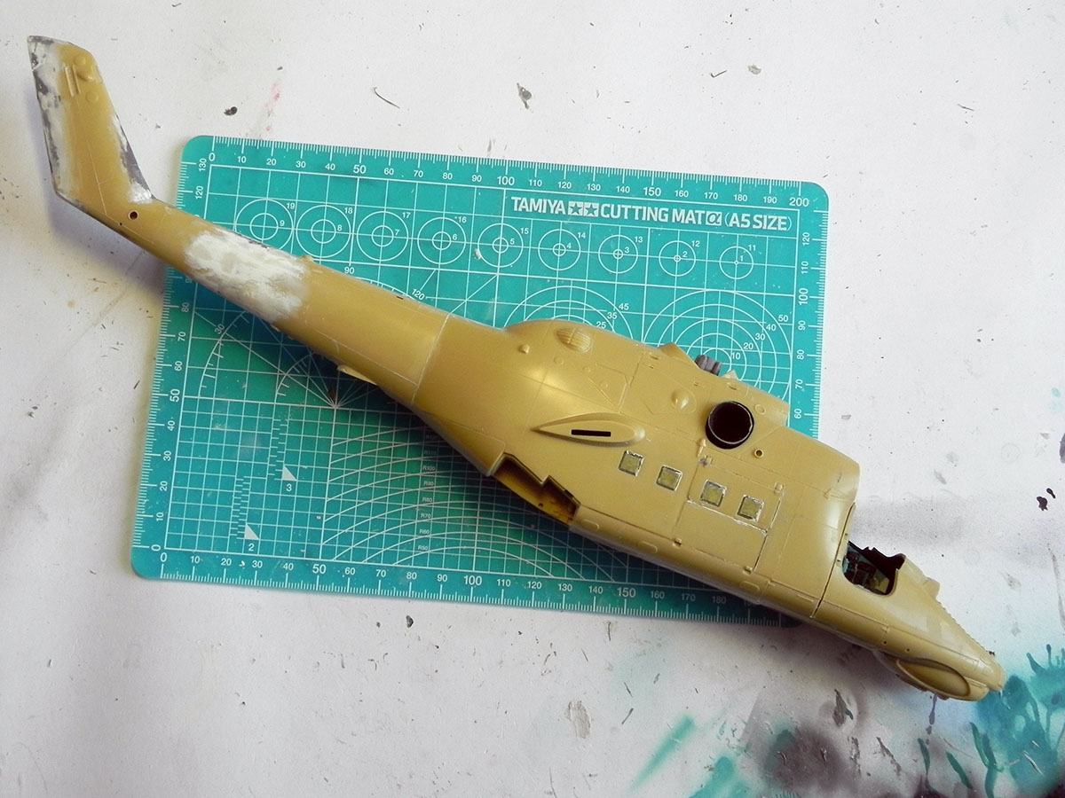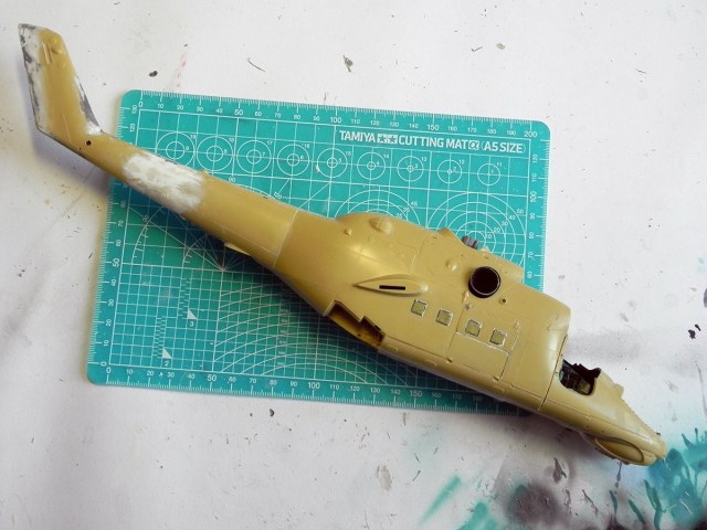 Сейчас занимаюсь фюзеляжем. Десантный отсек покрасил для фона, всё равно будет закрыт. Хвостовую балку всё-таки решил удлинить. Я знал, что она короткая. Но не знал, на сколько