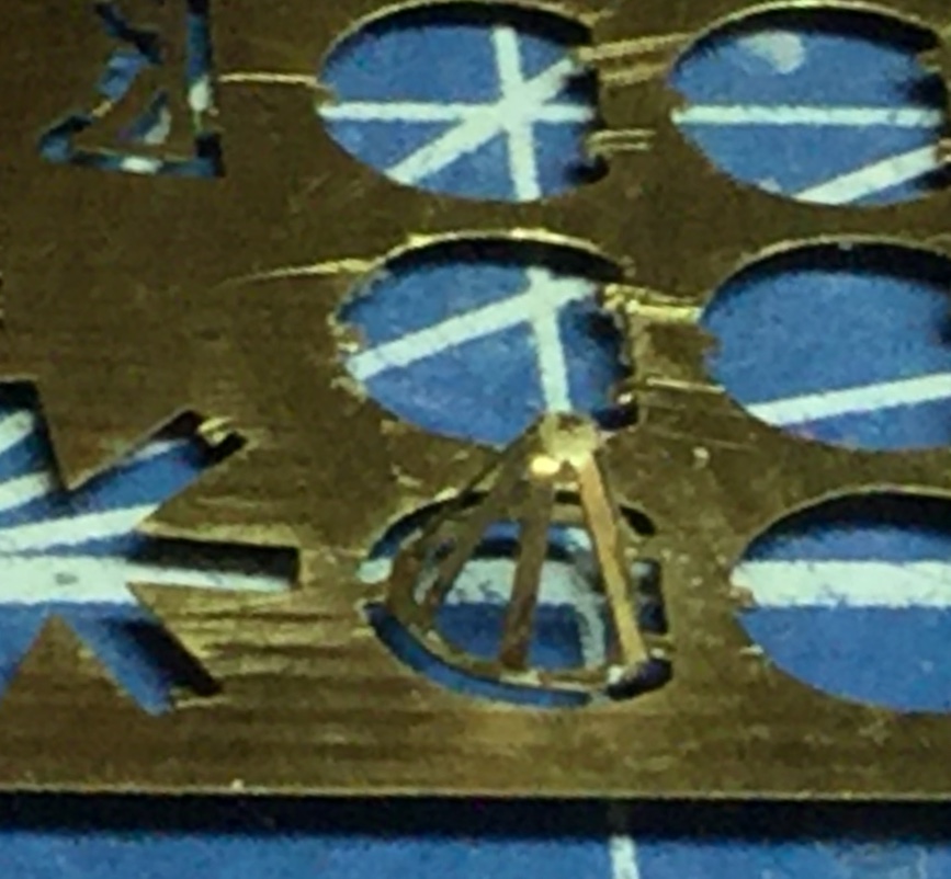 . Помню много мучениц мне доставила сборка мелкой 47-мм артиллерии, поскольку на оригинале эти пушки были на достаточно своеобразных наборных тумбах и производитель модели решил их изобразить в травлении. Я очень долго мучился тогда подгоняя основание тумбы и травленую деталь упоров поворотного штыра. Ну ни как не получалось их нормально и аккуратно склеить. Нынче я за ранее придумал способ достаточно простой и уверенной сборки этих деталей. Весь секрет был в том, что основа6ие от платы травления не нужно отрезать до момента, пока вся тумба не будет собрана воедино. Так распорки гораздо легче монтировать и обрабатывать всю деталь от излишков клея.