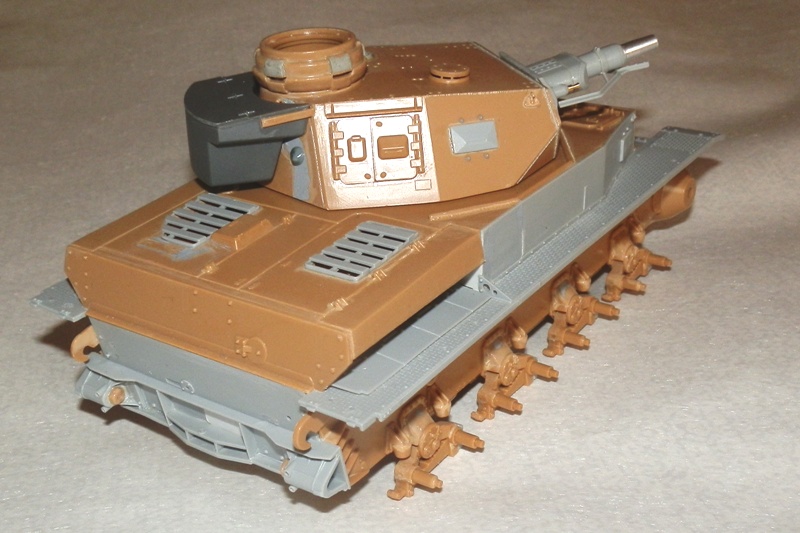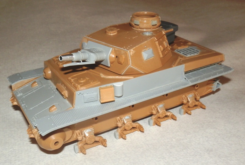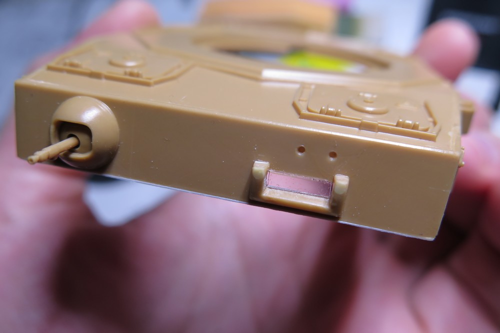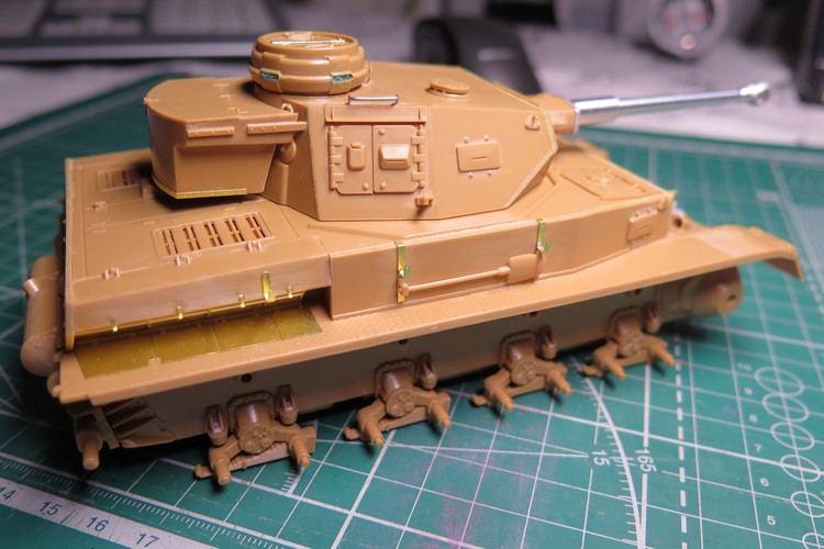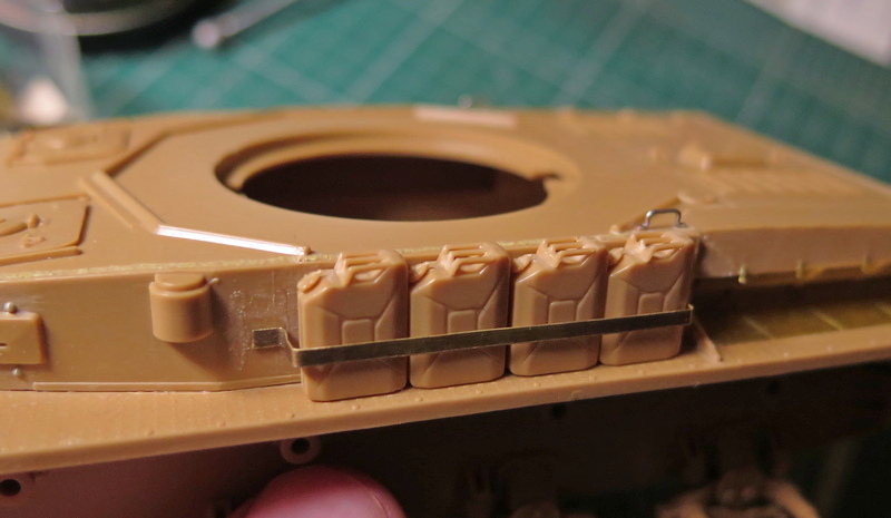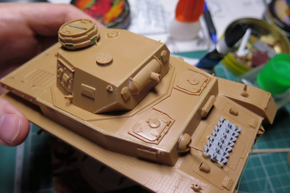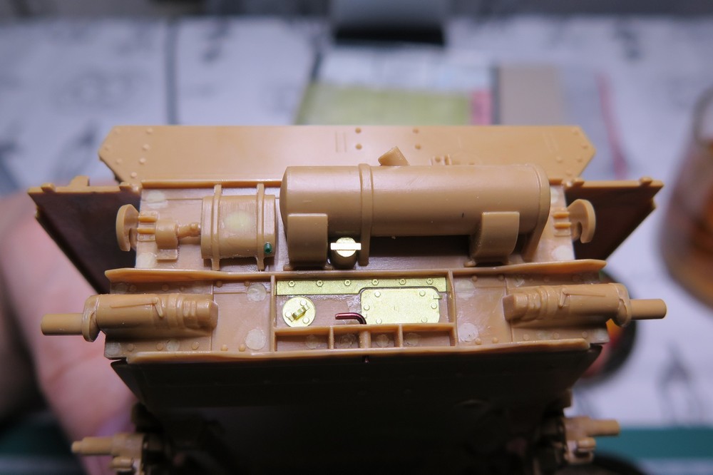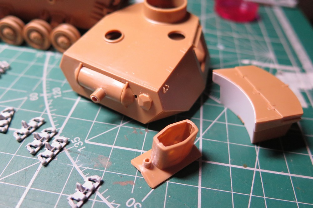 Зашпаклевал следы толкателей на корме, добавил мелочей. Сделал крепление запасных траков на лбу корпуса. Подсобрал башню, проложил сварные швы - вроде везде где нужно )
