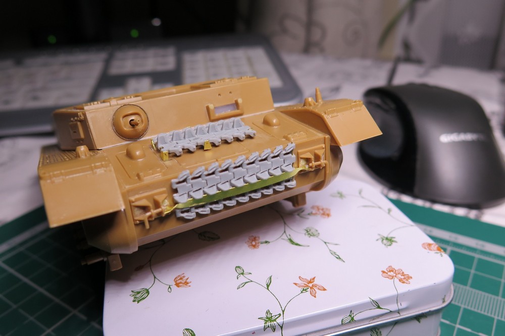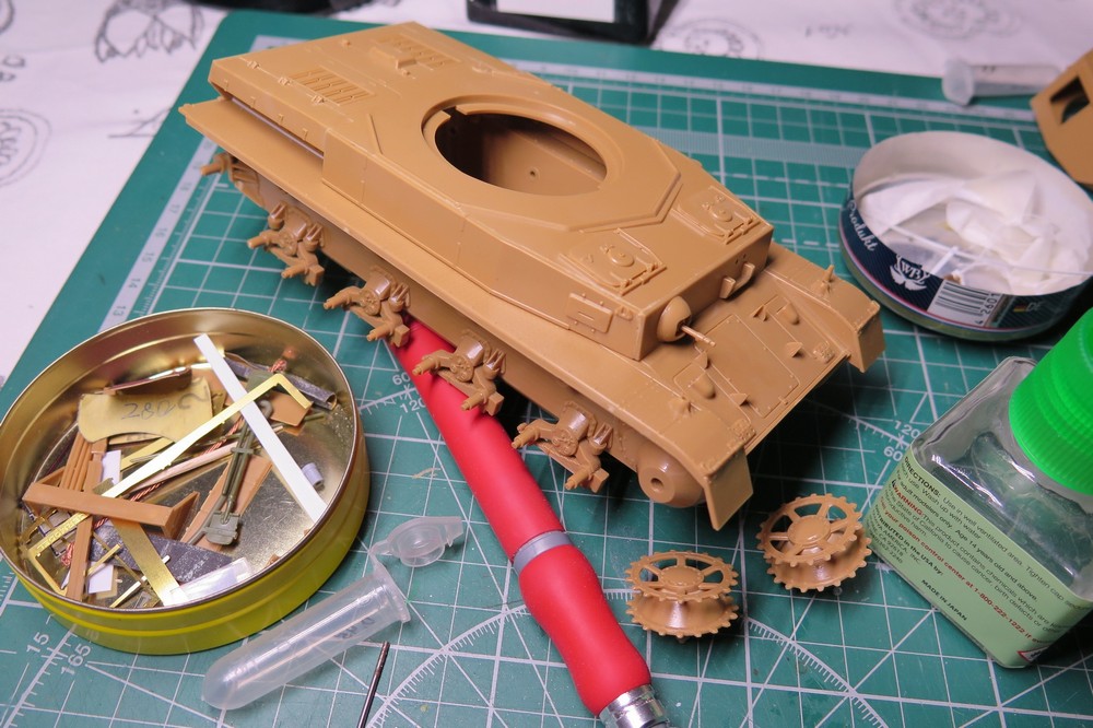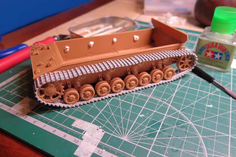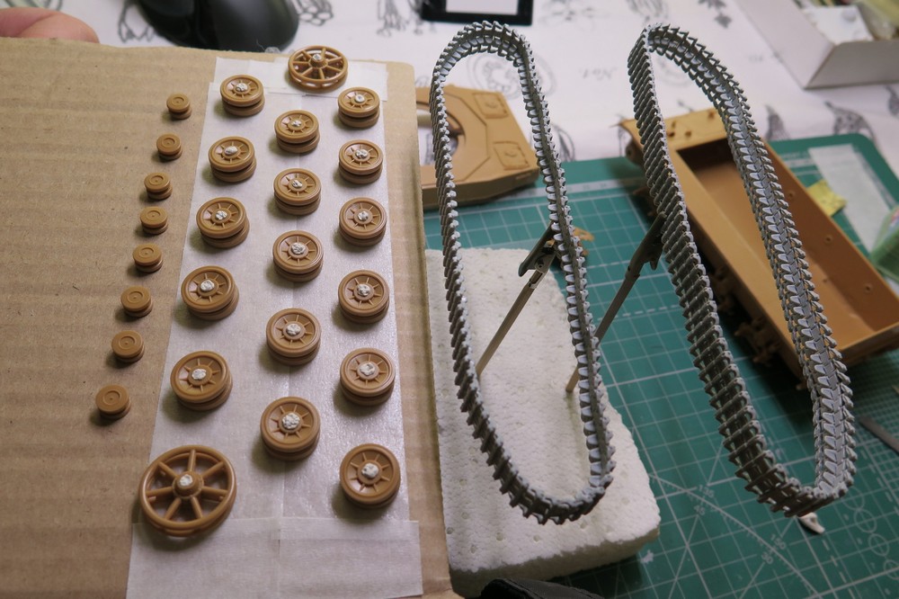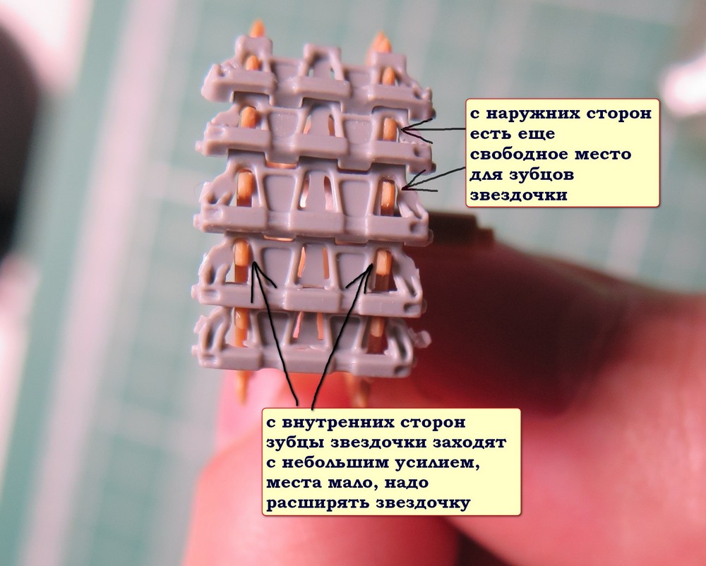 Склеил ведущие звездочки, не примерив их. В итоге оказалось, что на ведущую звездочку гусеница надевается с небольшим усилием, то есть после окраски не будет надеваться вовсе. Придется распиливать и добавлять полоску пластика.