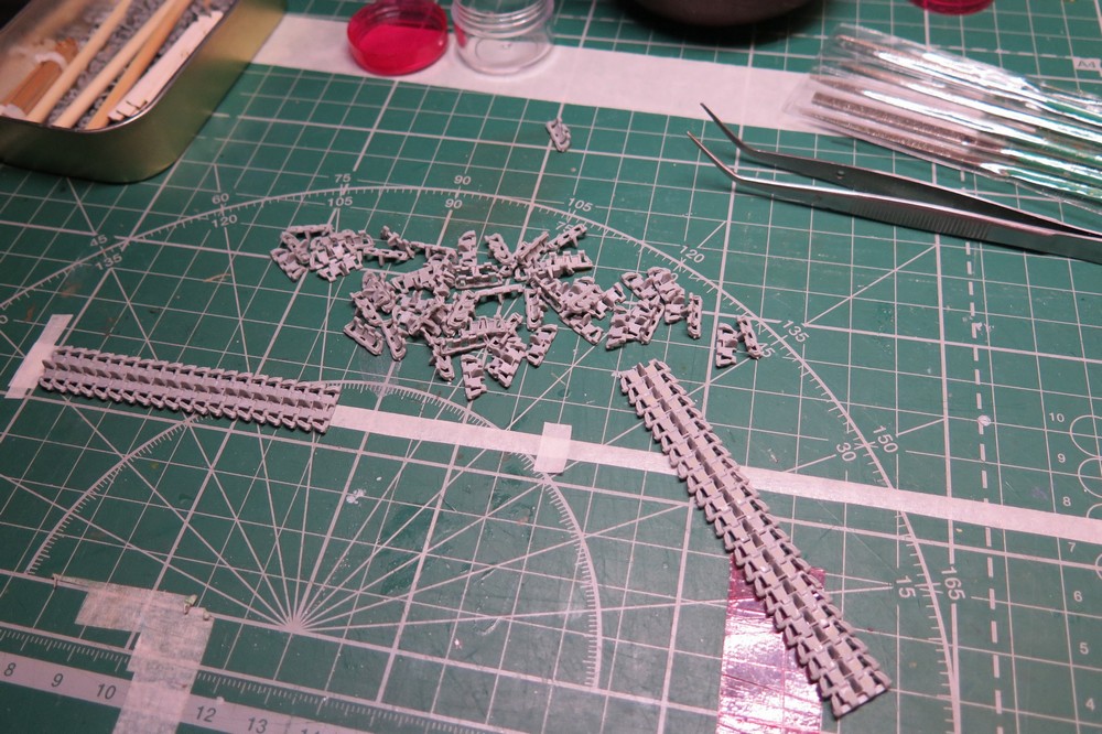 Собрал злополучные траки в гусеницы. Нудная работа их зачищать почти с каждой стороны, - облоя было немало. Всего 200 траков (по 100 на сторону). Ну и плюс около 20 запасных.