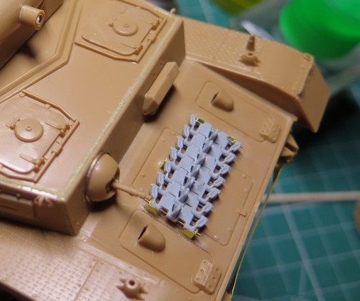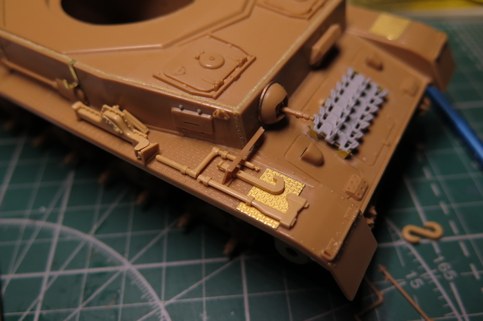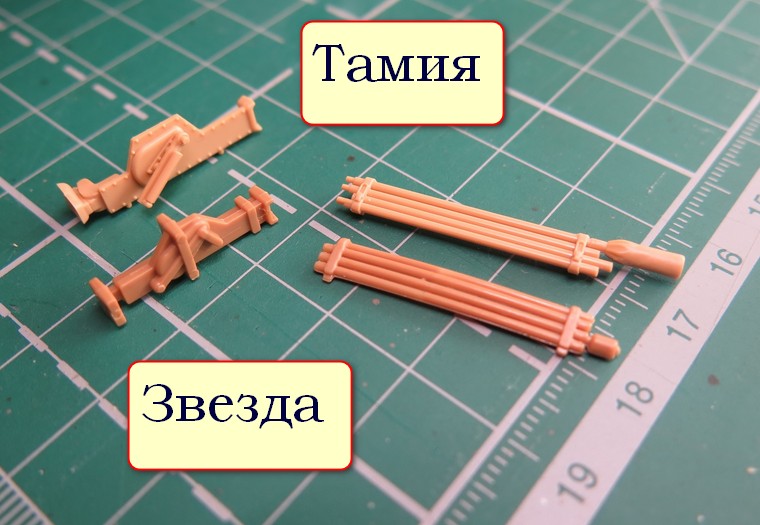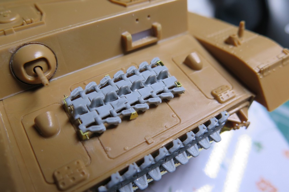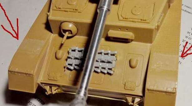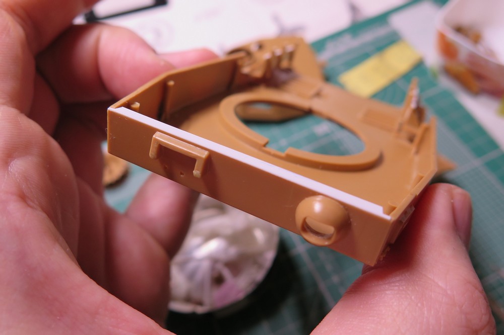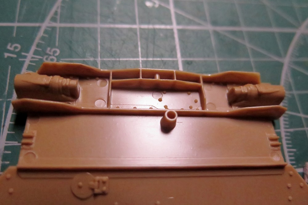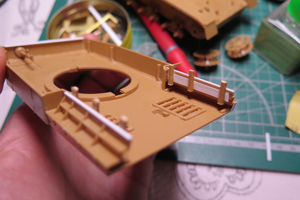 В моей коробке по инструкции вроде модификация G, но на G чаще всего встречается одна фара Бош на левой полке. В общем срубил я пеньки под фары, но там (под фарами) предполагается выштамповка, типа профнастила, как и на остальной длине надгусеничной полки. Поэтому на эти зашкуреные гладкие места придется что-то придумывать. .
