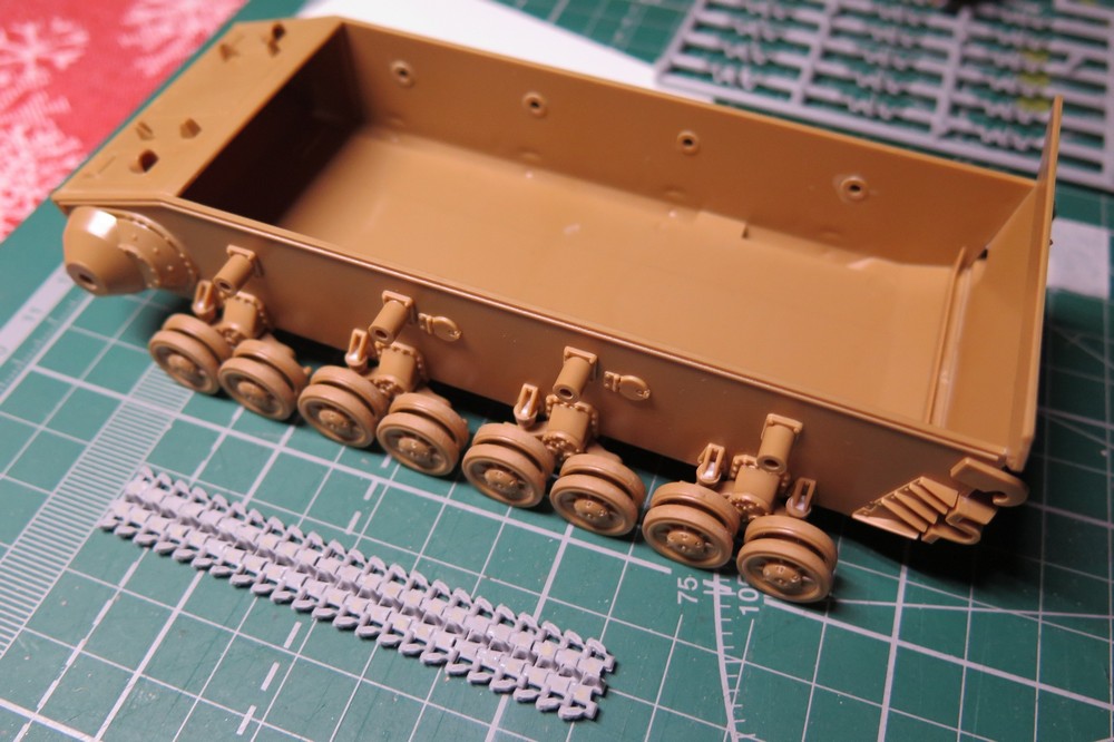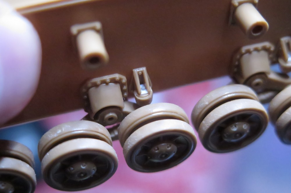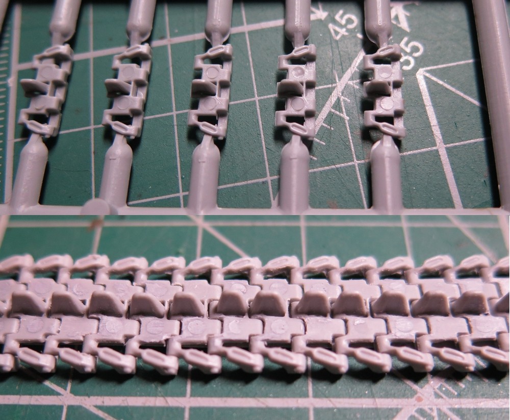 Траки имеют следы от толкателей. сначала их шпаклевал, потом бросил и просто обрабатывал напильником, благо они неглубокие.