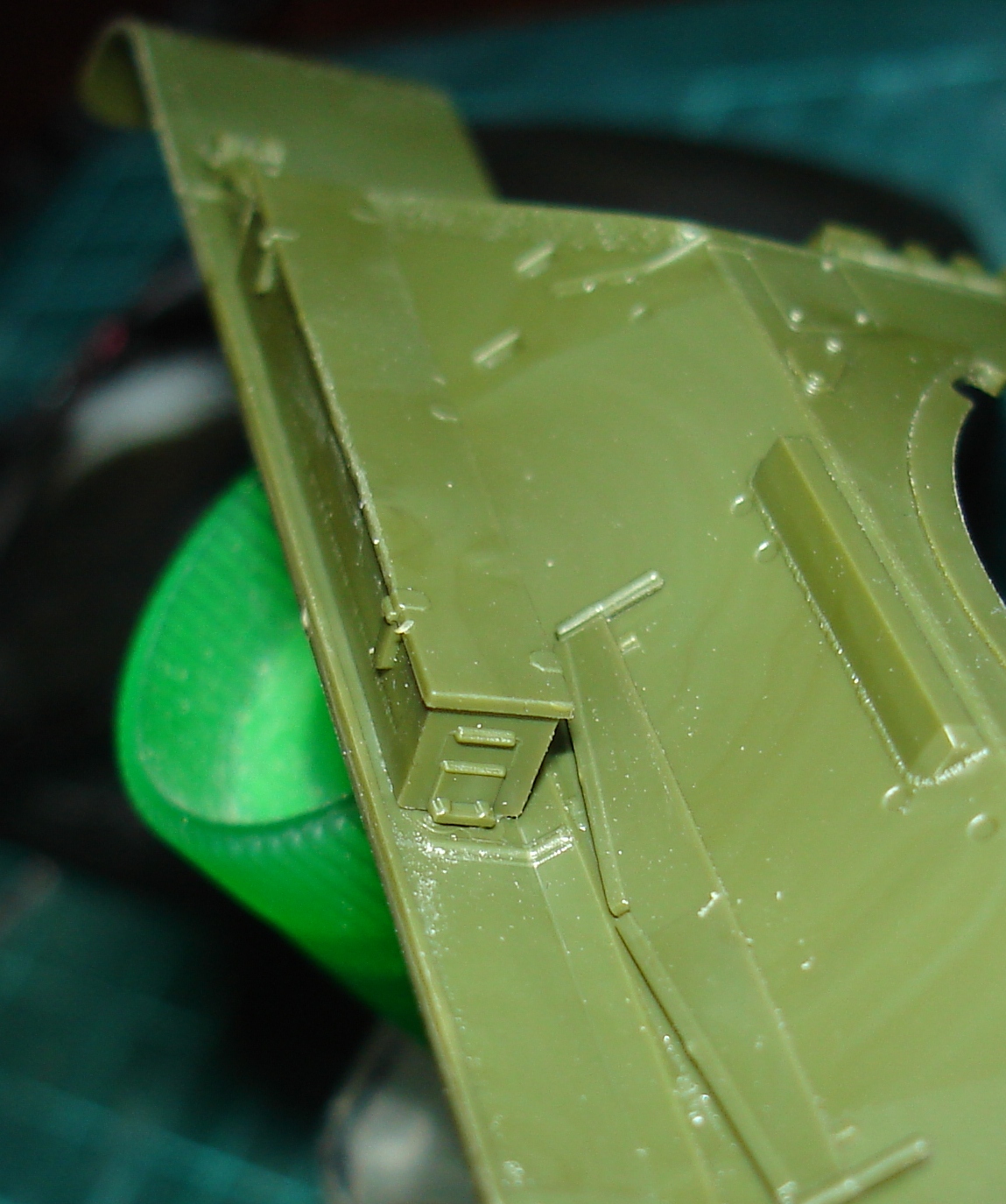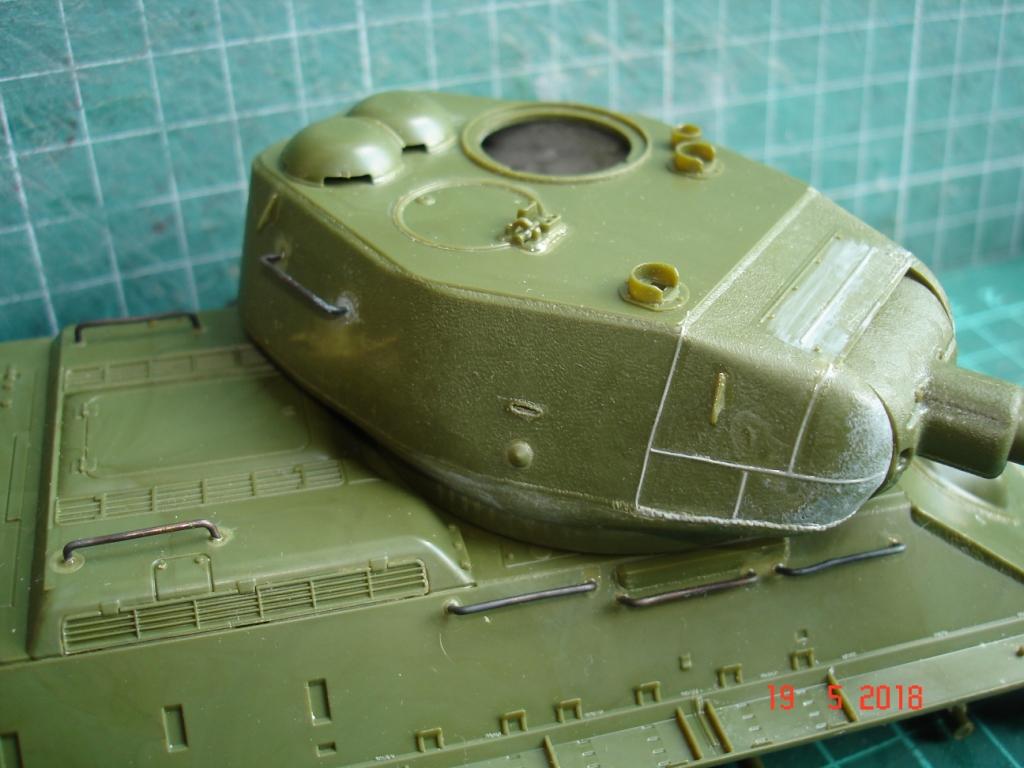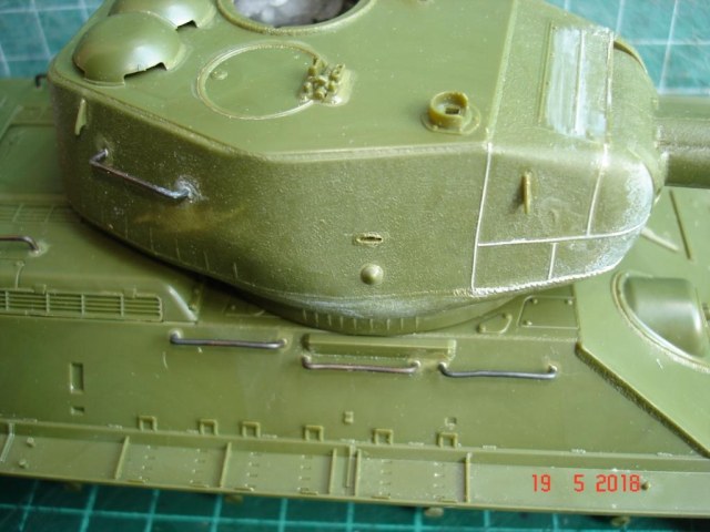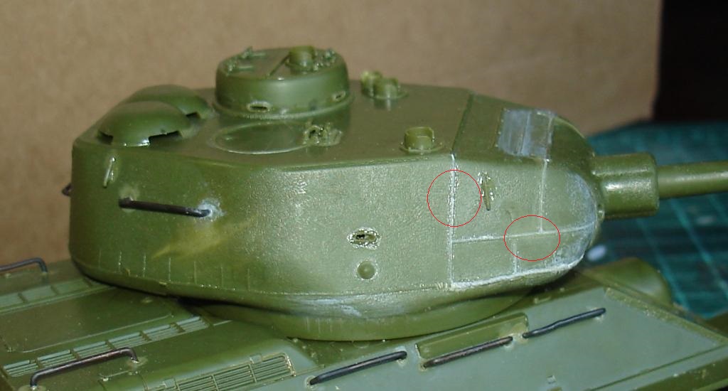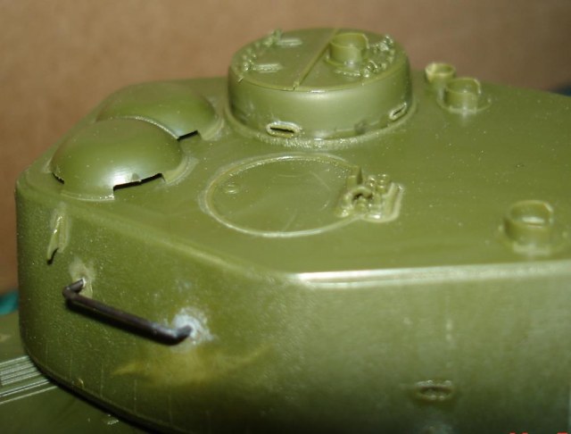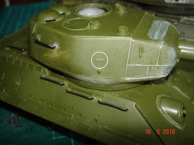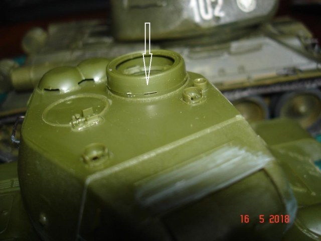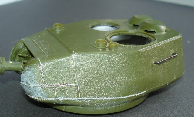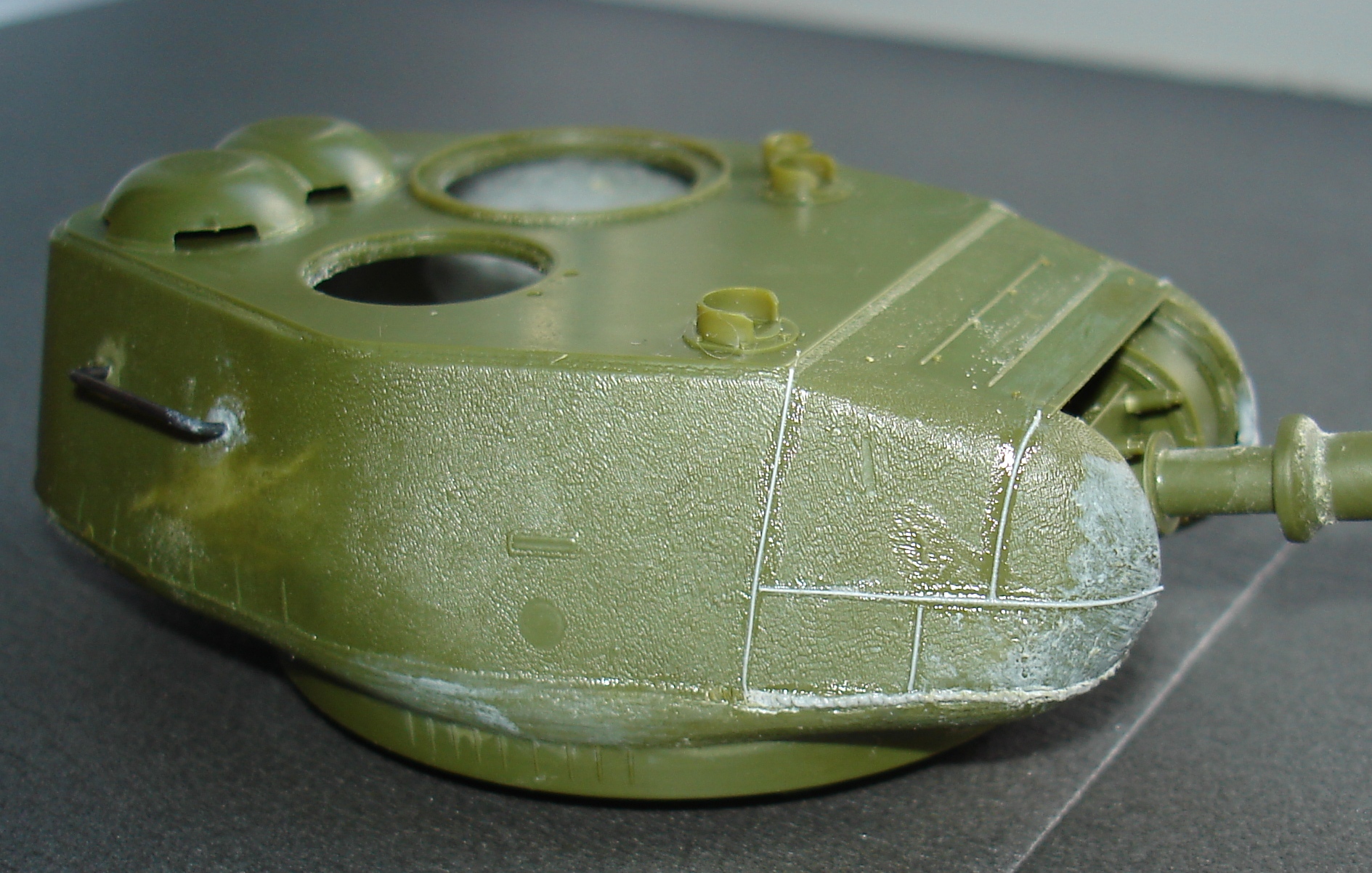 Сборку башни проводить лучше не спеша и поэтапно. Поспешил и получил ступеньки, пришлось шпатлевкой поработать, но косяк чисто мой. Восстановил следы литиевой формы на башне, немного грубо, но потом еще поработаем нулевкой и сгладим. Не понравилось решение смотровых щелей на правой стороне башни. Еле угадывается. Тоже самое и на командирской башенке.