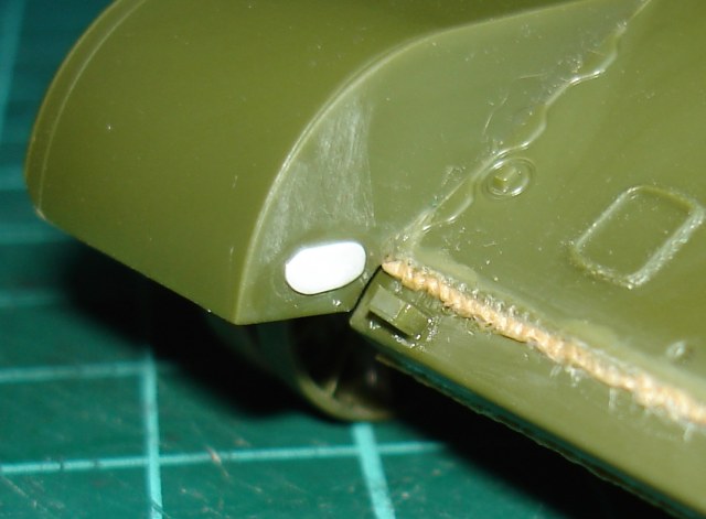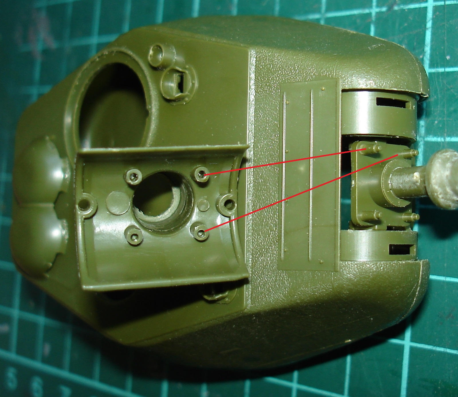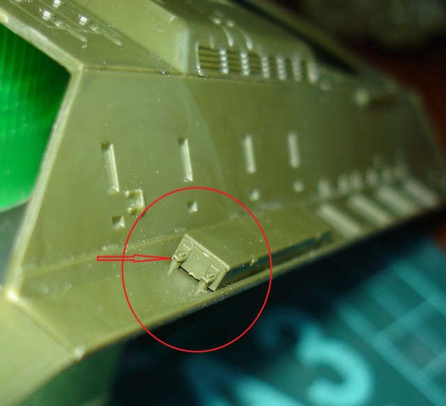 Так же считаю неудачным решением крепление маски орудия. Не смертельно, но вызывает неудобство. Конструкция имеет небольшой люфт по линии горизонта. Примерял без ствола. Потом вклеил ствол и одел маску. Места контакта заранее обильно пролил клеем. (колодцы в маске)