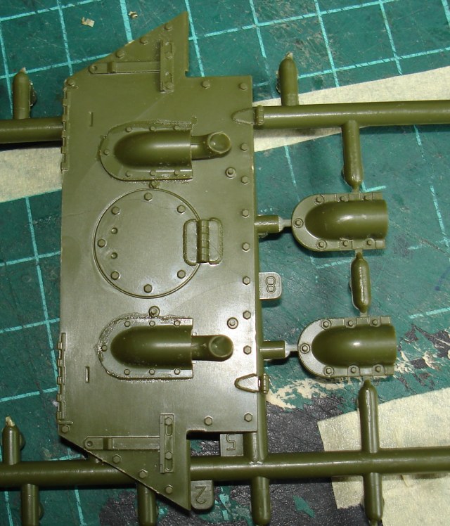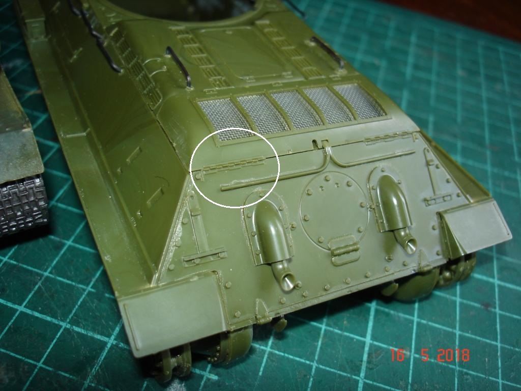 сами трубы выхлопа имеют четкие посадочные места. Инструкция предлагает собрать задний верхний броневой лист (№ 8А деталь в сборе) и потом собирать корпус. Нижняя часть плюс верхняя и плюс этот лист. только вот точек (упоров) нет. Если собрать низ и верх и потом вклеивать эту деталь в сборе можно здорово вспомнить могучий и великий... Просмотрев видеоролик Игоря пошел тем же путем. Склеил низ корпуса и эту деталь. Выровняв ее по скосам корпуса. Потом верхняя часть и все встало на ура. Корпус клеил по участкам. прихватил сушка, дальше прихватил... На старой модели состыковать кожух с сеткой и корпус без щелей не вышло. Тут все встало как литое..