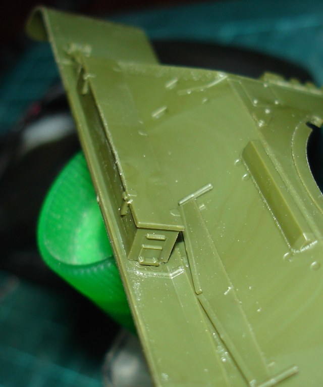 Вот крепление на модели ящика зип. Их два и оба крепятся так. На полке присутствуют бонки и на них крепится ящик. Как видно на фото ящик ЗИПа опирается на 4-е точки и висит. Точки соприкосновения малы и у меня один ушел гулять (слегка пальчиками надавил) пришлось мудрить и делать еще поперечные вклейки опоры. Так надежней будет Хотя сомневаюсь что ящик так весел на реальной машине.