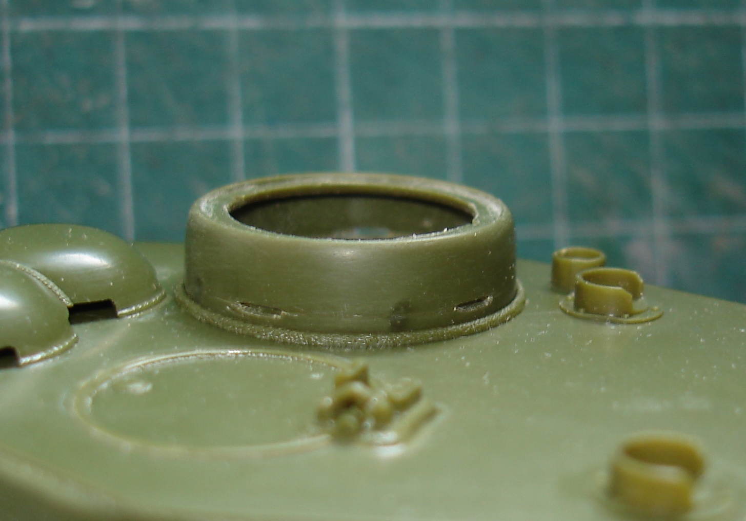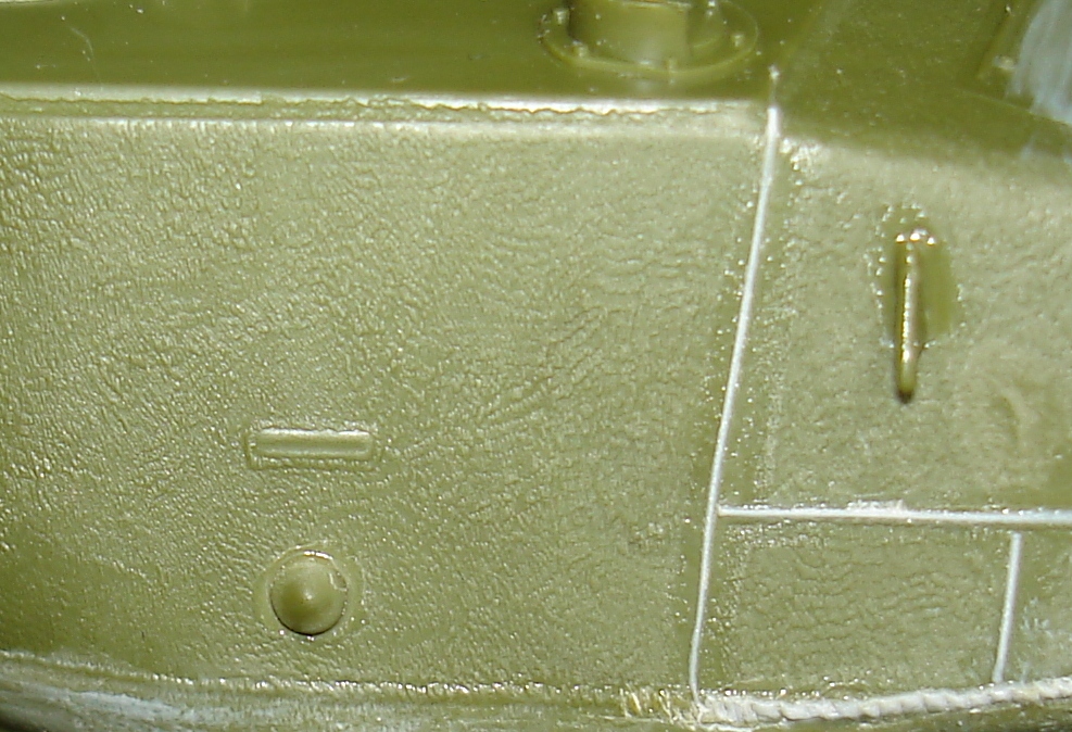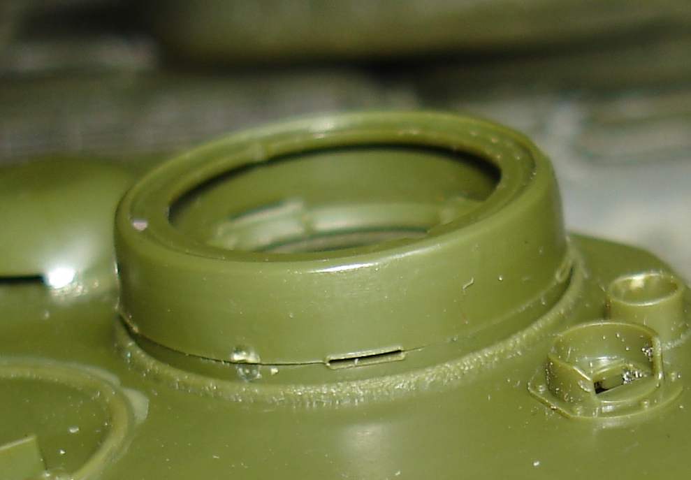 Даже на башнях гайках есть объем этих щелей. А вот в наборе на правой стороне башни щель едва угадывается. На командирской башенке она сквозная и более четкая, но стоит чуть отодвинуть модель и все, она теряется..