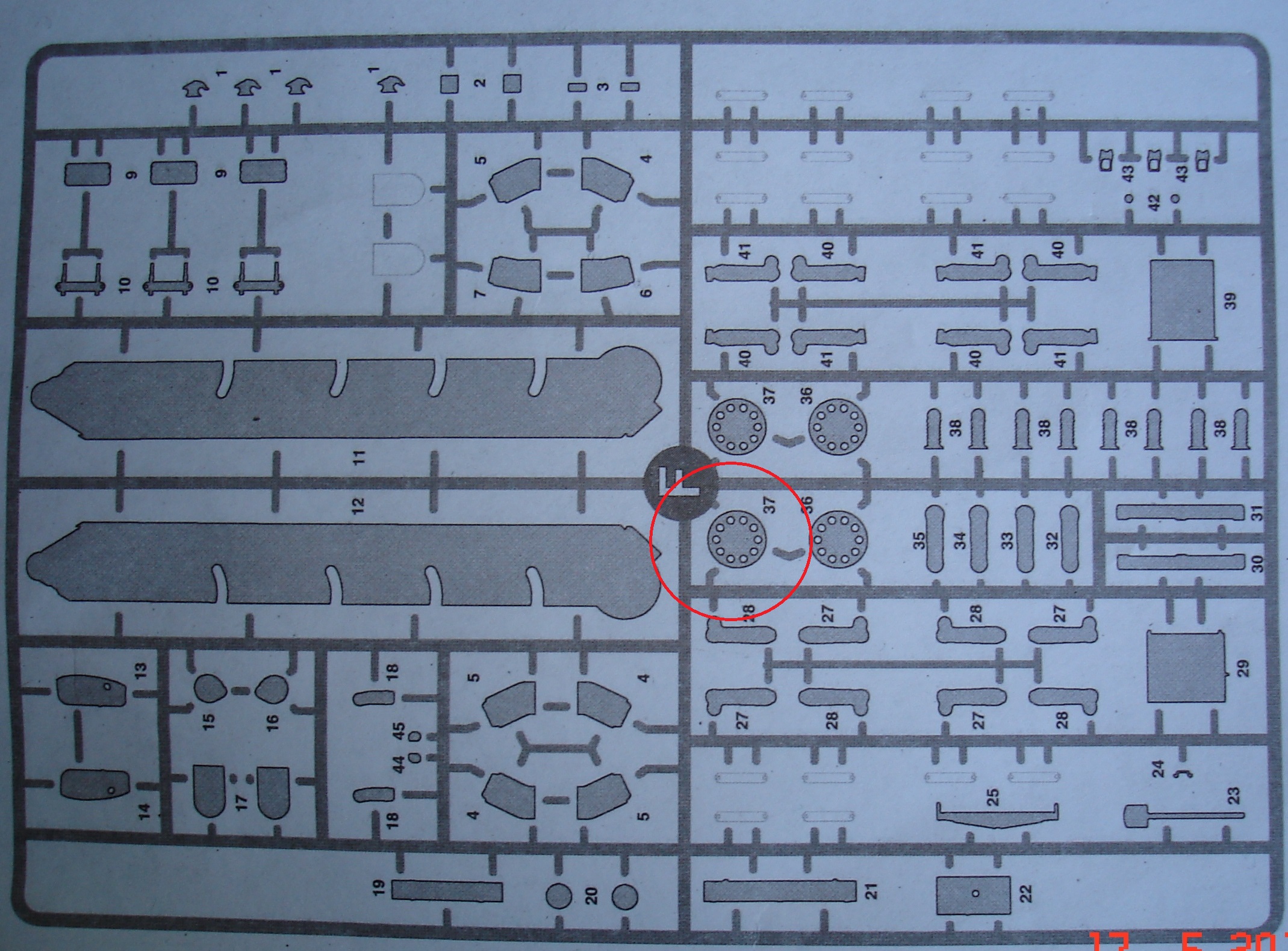 Верхний кормовой лист. Бронировка выхлопа дана двумя вариантами. Рамка F. В инструкции указаны детали под № 17, но присутствуют на этой же рамке детали под № 8