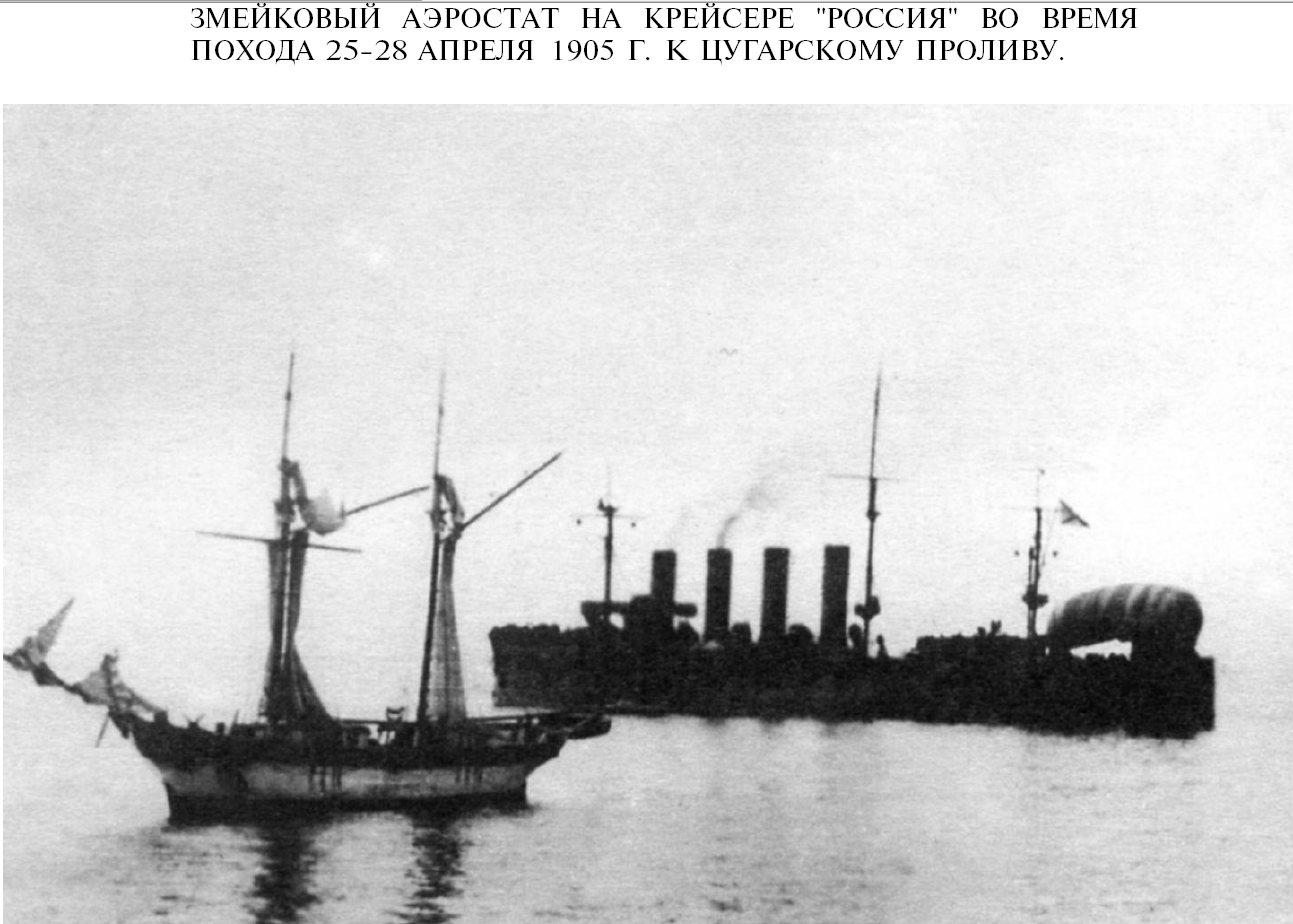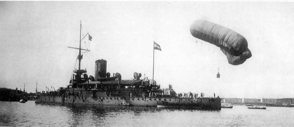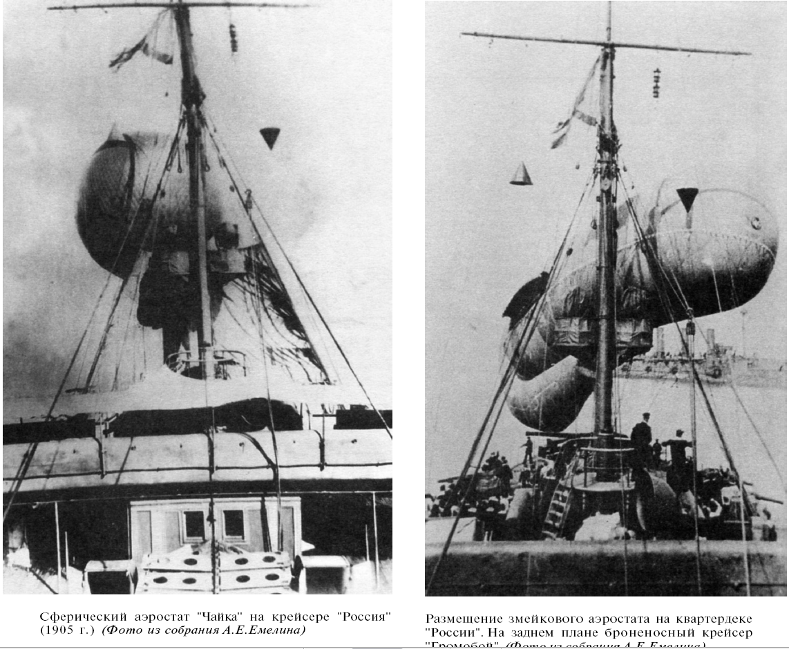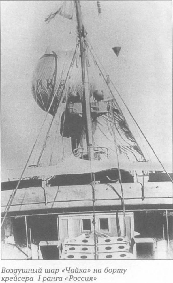 Довольно эффективно действовала "аэрогруппа" , размещенная на русском броненосном крейсере " Россия" во время русско-японской войны. Группа состояла из привязного аэростата системы " парсеваль" и воздушного шара "Чайка" :