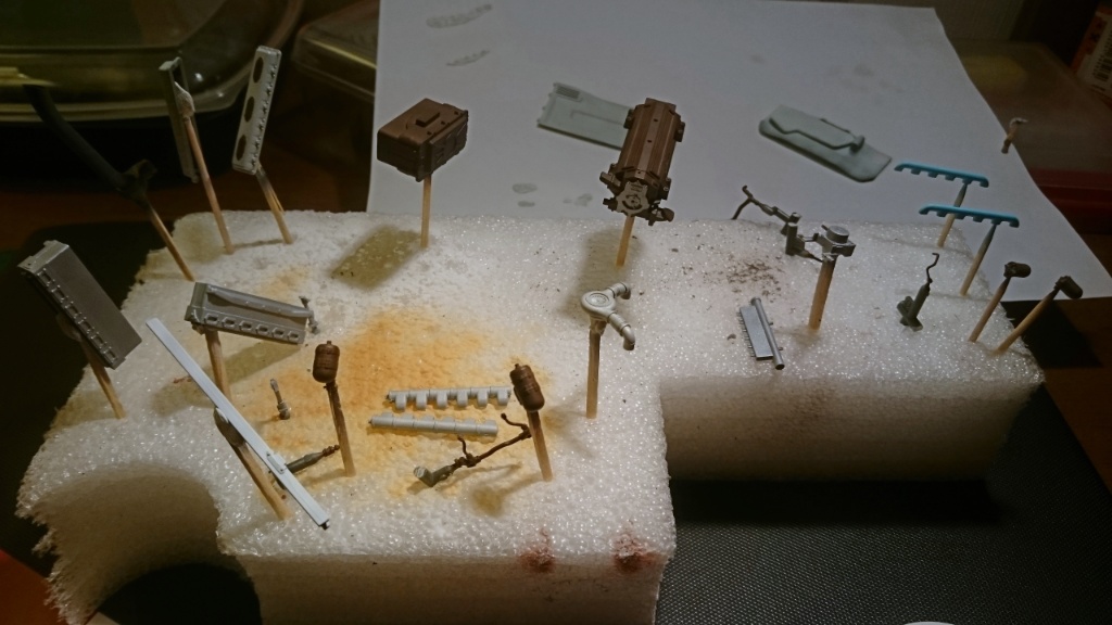 Ладно, в общем, и целом, с двигателем и МТО закончил. Приклеены на цианокрилат экраны, медные проводки загрунтованны и покрашены в метал (хоть и не видно этого) и немного припылил пигментом: