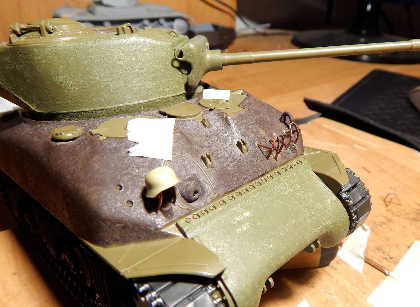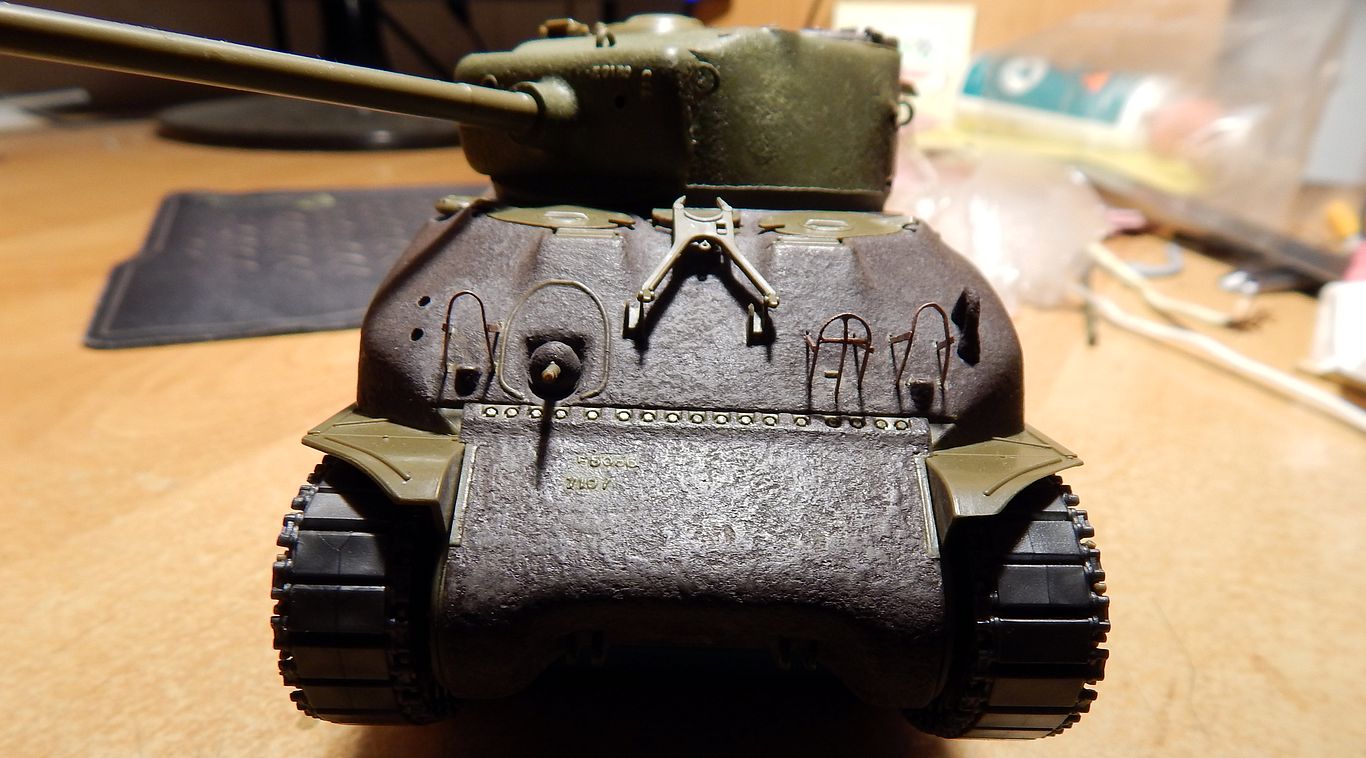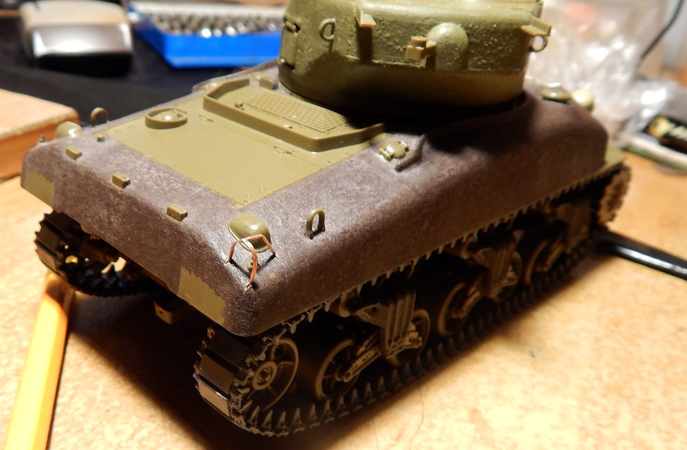 Кстати, небольшое совпадение... Я у своего Шермана ограждение фар тоже менял на самодельные из проволоки. Смотрится намного правдоподобней!