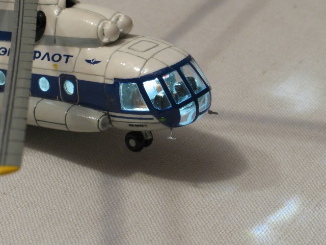 Он у меня оказался-таки заваливающимся на хвост, поэтому при фотосъёмке пришлось приклеивать передние шасси к фоновой ткани на двусторонний скотч. Но ткань тянется, и модель всё же чуть-чуть нос приподнимает.