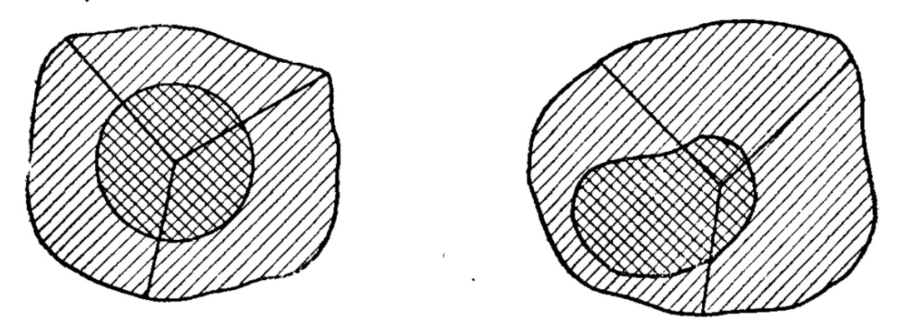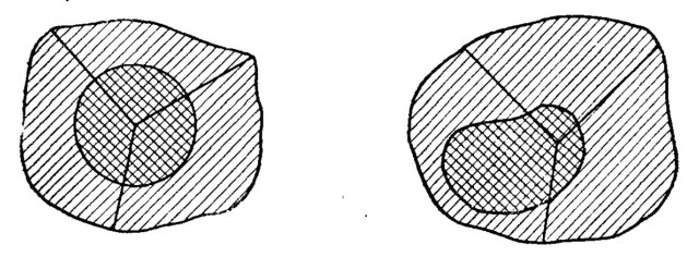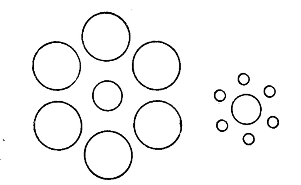 два центральных круга равны между собой, тогда как круг, окруженный маленькими кружками, кажется больше второго.
