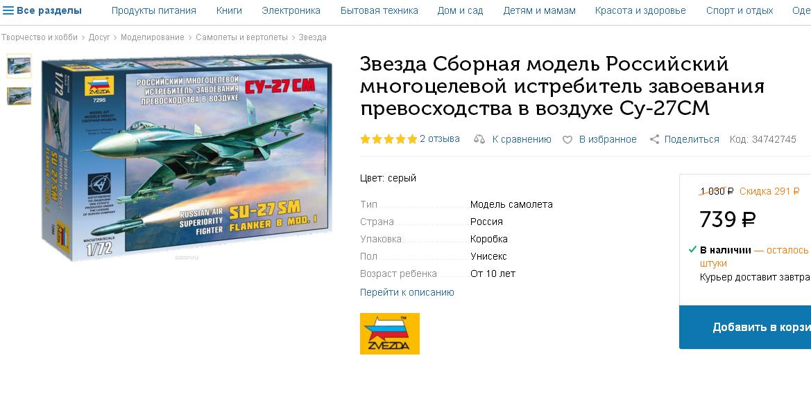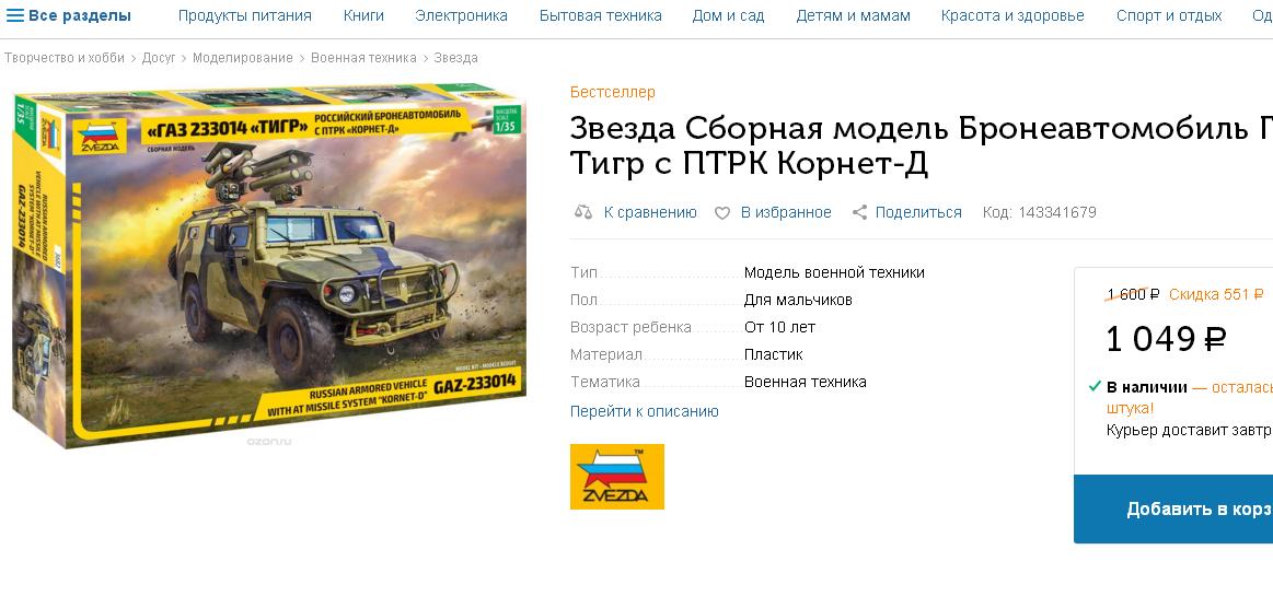 https://www.detmir.ru/catalog/index/name/modeli_dlya_sborki/per_page/20/order/p rice-asc/?q=%3AageTo%...2.ОЗОН. Тоже любит делать скидки на данные товары. Какие плюсы у ОЗОН - во первых доставляет во многие пункты выдачи по России цена от 500р (товара) - 99р (доставка), причем сдесь можно обналичить бонусы СПАСИБО от Сбера до 70 процентов от них - и получить модель почти даром. ОЗОН бывает настолько щедр, что предлагал Ми-24 от звезды в районе 350р - где либо еще такой цены я не видел...