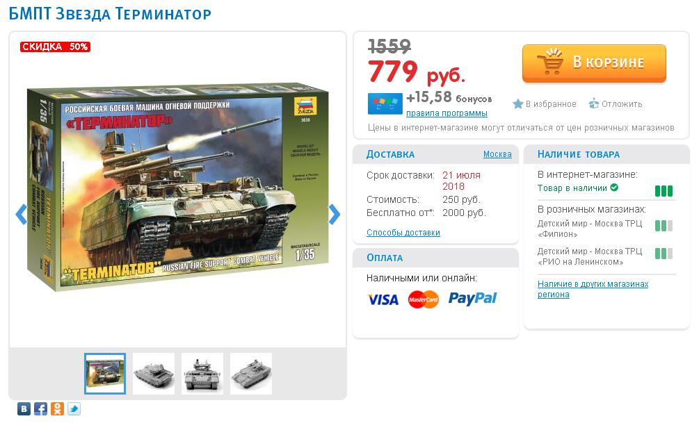 1. Детский МИР. Терминатор от Звезда со скидкой 50 процентов. Сайт детского мира хорош тем, что у него есть доставка в любой город (как мне кажется) наподобие пункта выдачи и стоит 49 рублей. Так же в разделе по моделям много еще скидок на производителя.