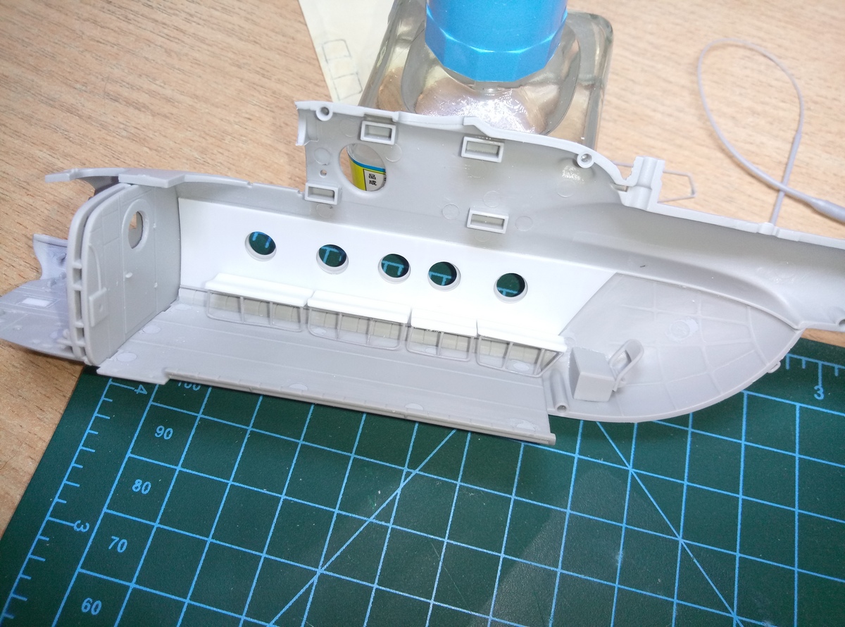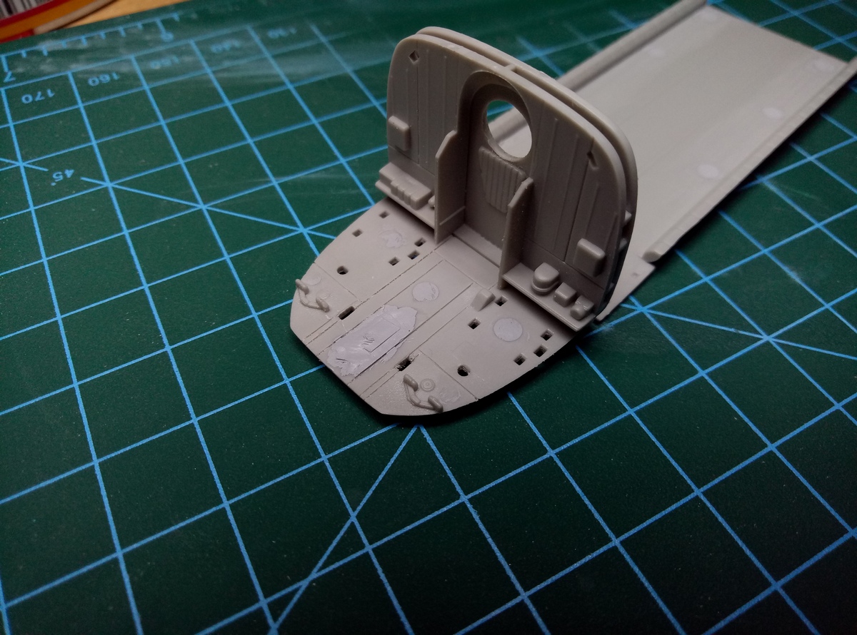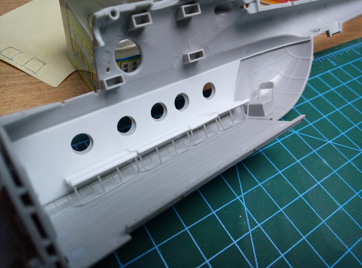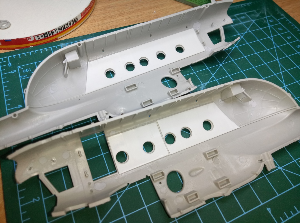 Удалил с крыши силовые элементы. Наклеил пластик внутри салона на боковые панели. Заклеил дошираком заднюю часть панели приборов, добавил кружки. Корневерткой сымитировал отверстия крепления задних крышек панелей приборов. Удалил пьедестал в кабине, т.к. в прототипе используется другая панель. Да и в той модификаци, что изобразил хоббибосс её надо срезать, отодвигать назад и немного опускать.