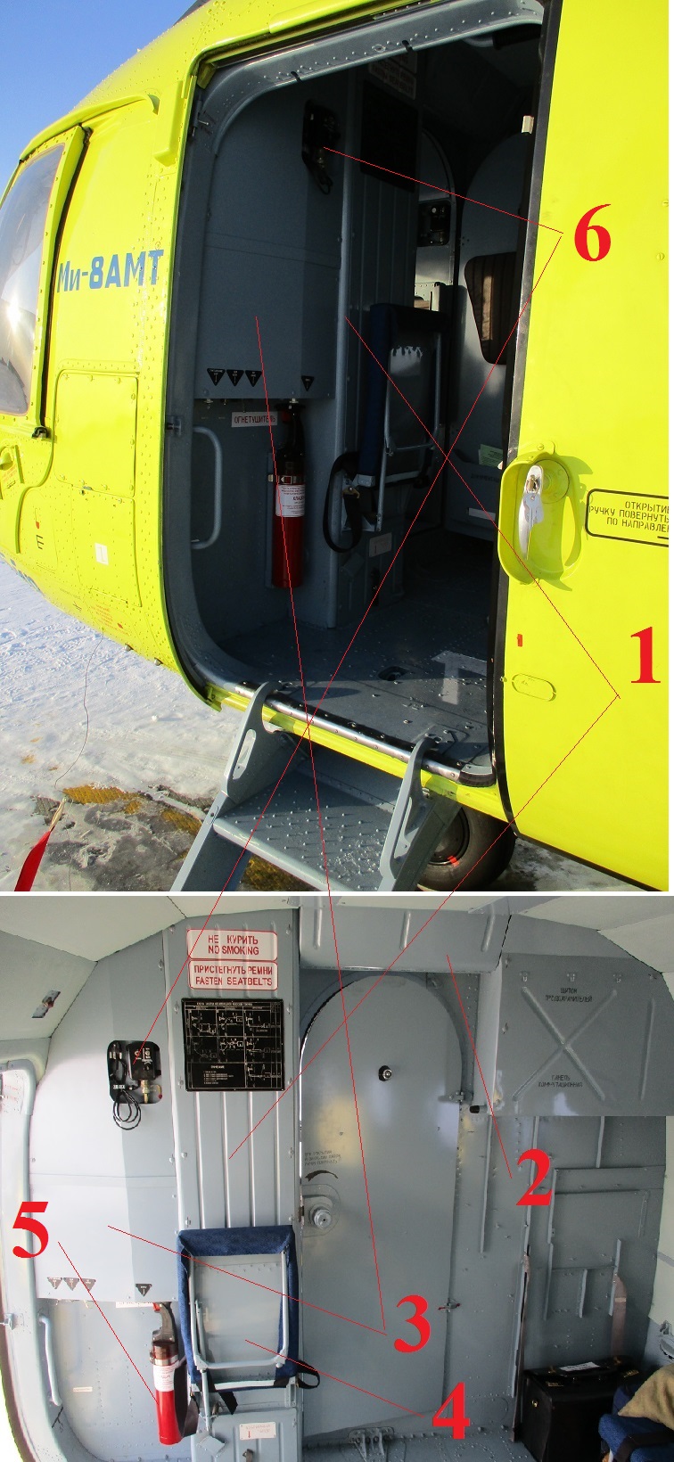 5) Огнетушитель, может устанавливаться в месте, в зависимости от требований авиакомпании.