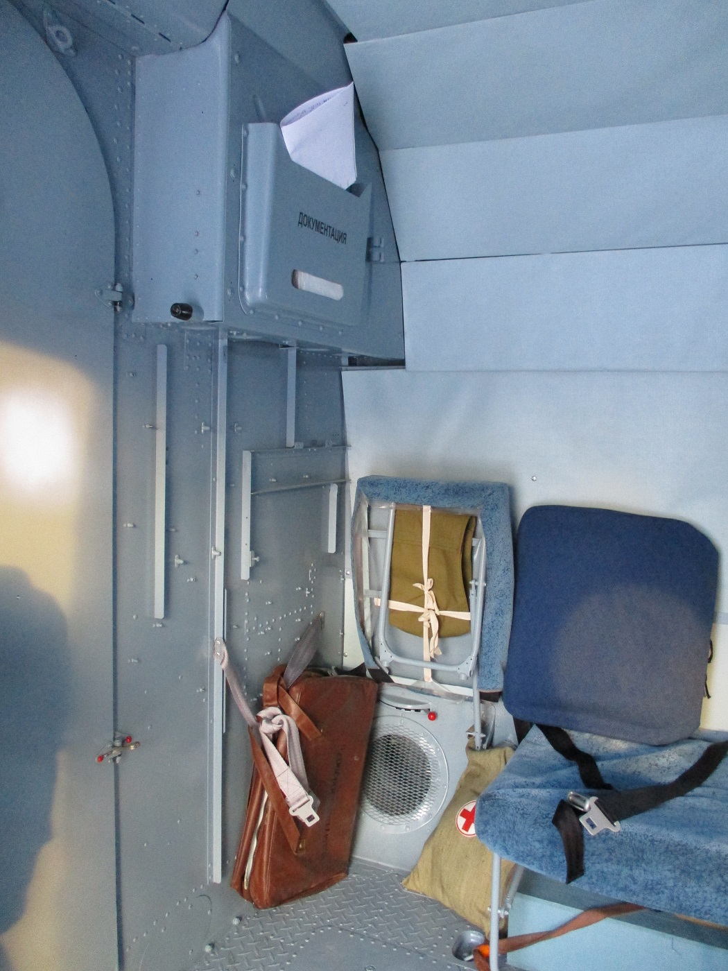 Ничего там нет. Может устанавливаться еще одно пассажирское сидение. У каждой авиакомпании, интерьер может быть изменен различными дополнениями (как на фото МИ-8Т прикреплённом), типа портфелей, ящиков ЗИП, аптечек. Обратите внимание на входное сетчатое устройство вентилятора. Есть на всех вертолётах.