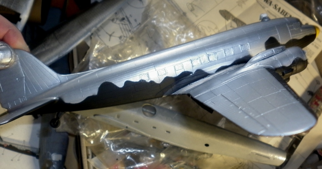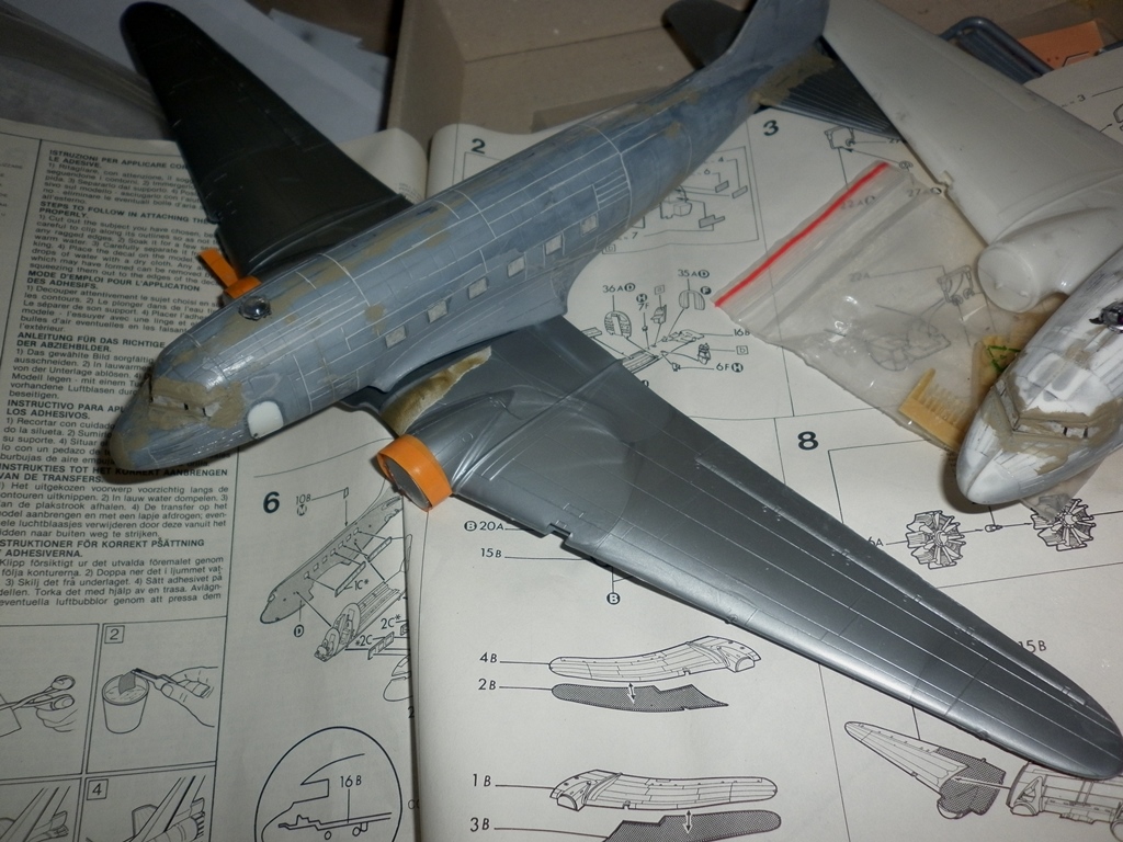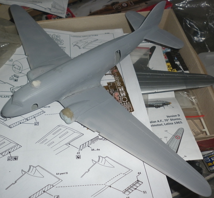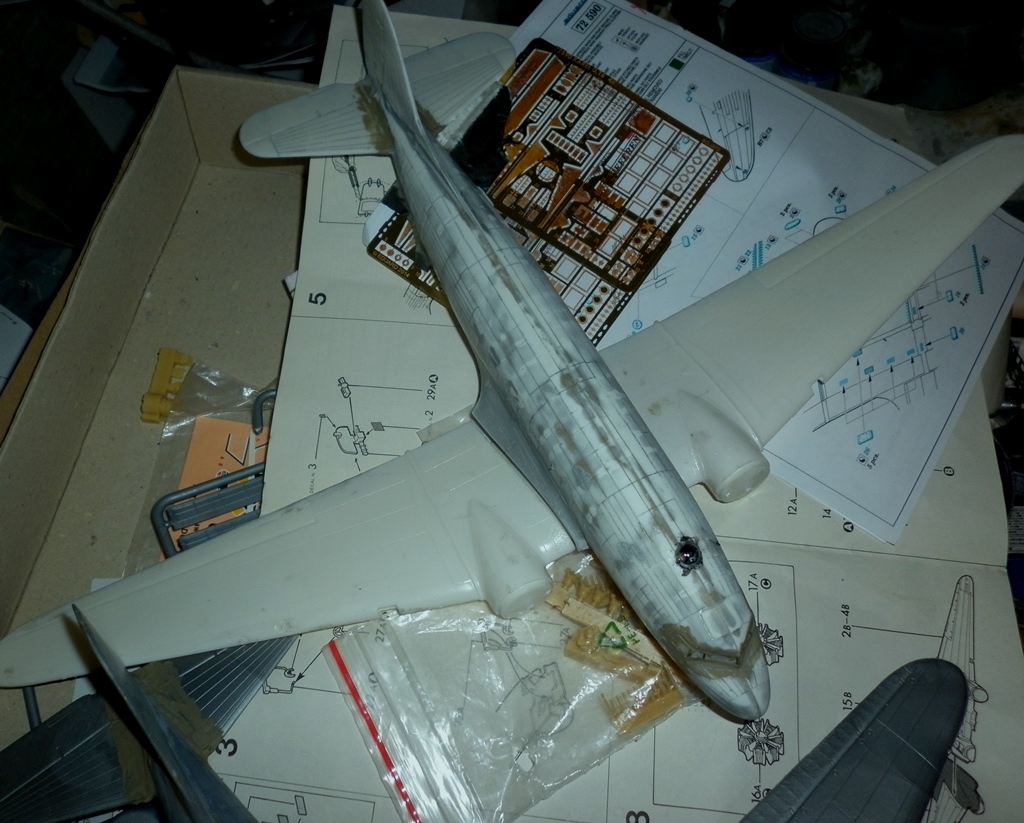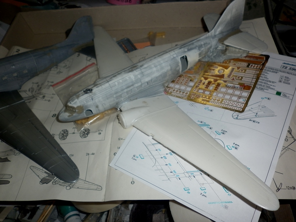 Так как доделать "вдову" и "репортера" пока не удается - в магазин не привезли лак и скотч, пока займусь следующей моделью. Точнее, парочкой. У меня имелась одна модель от ЕСКИ с жутко поведенным фюзеляжем и крыльями. Шансы у модели остаться вечным долгостроем были очень велики, но ... на Е-бее приобрел у чешского коллеги кучу травления ( в том числе 3 полных комплекта на Докоту) и в нагрузку получил и саму Докоту со смоляными колесами и моторами и " кучку" декалей, позволяющий сделать модель в британской, австралийской, французской и американской раскраске. Тут подвернулся и этот конкурс,который без Дакоты, самого распространенного в мире военно-транспортного самолета будет неполным. Решил одну модель сделать нафаршированной афтемаркетом а вторую максимально "изкоробочной". Главная работа с моделью ЭСКИ - заделать лишний внутренний крой. На это ушла неделя.
