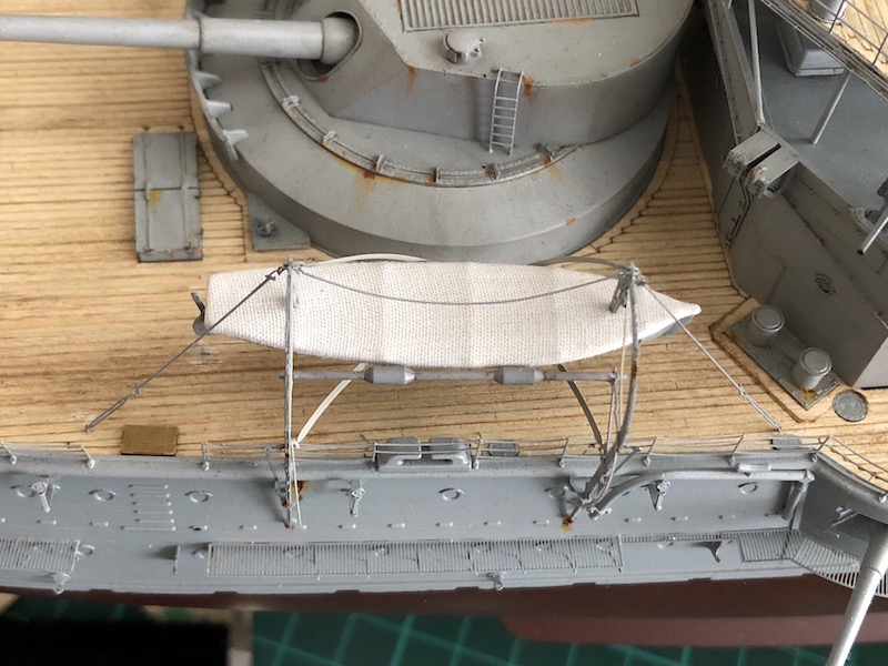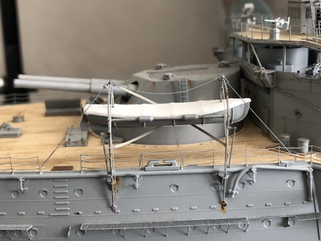 а это была проба пера так сказать. Первая кормовая шлюпбалка. Травление из двух наборов, чехол из ткани (возможно крупновата фактура, но не нашел более мелкой, то что мельче это уже шелк, а он блестит и просвечивает), фиксирующие парусину канаты пока родная китовая имитация из пластика