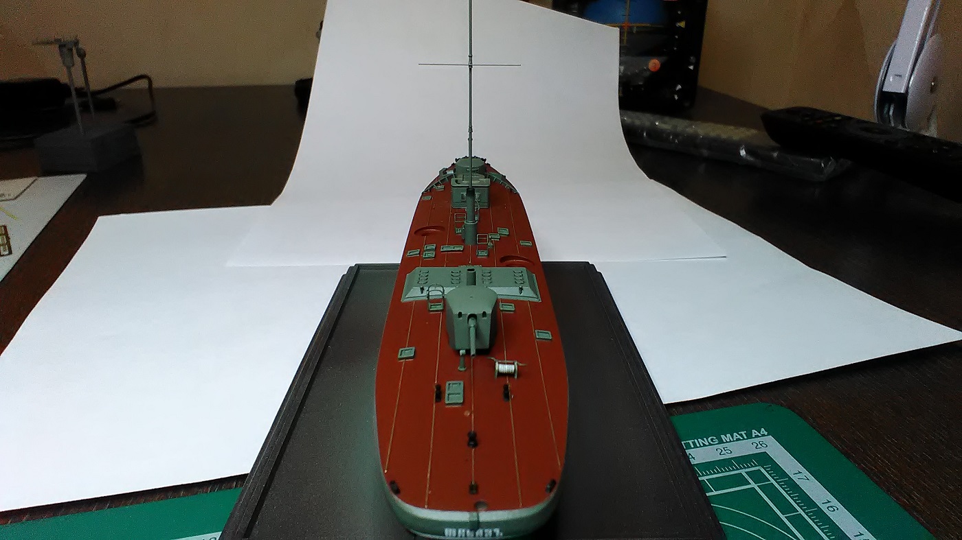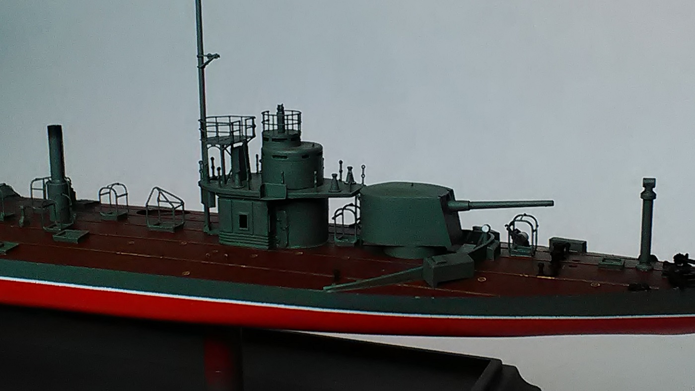 Палуба мостика, скорее всего тоже, была покрыта линолеумом. Но, возможно, просто окрашена в основной цвет. На крыше боевой рубки, наверно была деревянная решётка. Такие же решётки - помосты, могли установить и на орудийных бышнях, вокруг пулемётных установок.