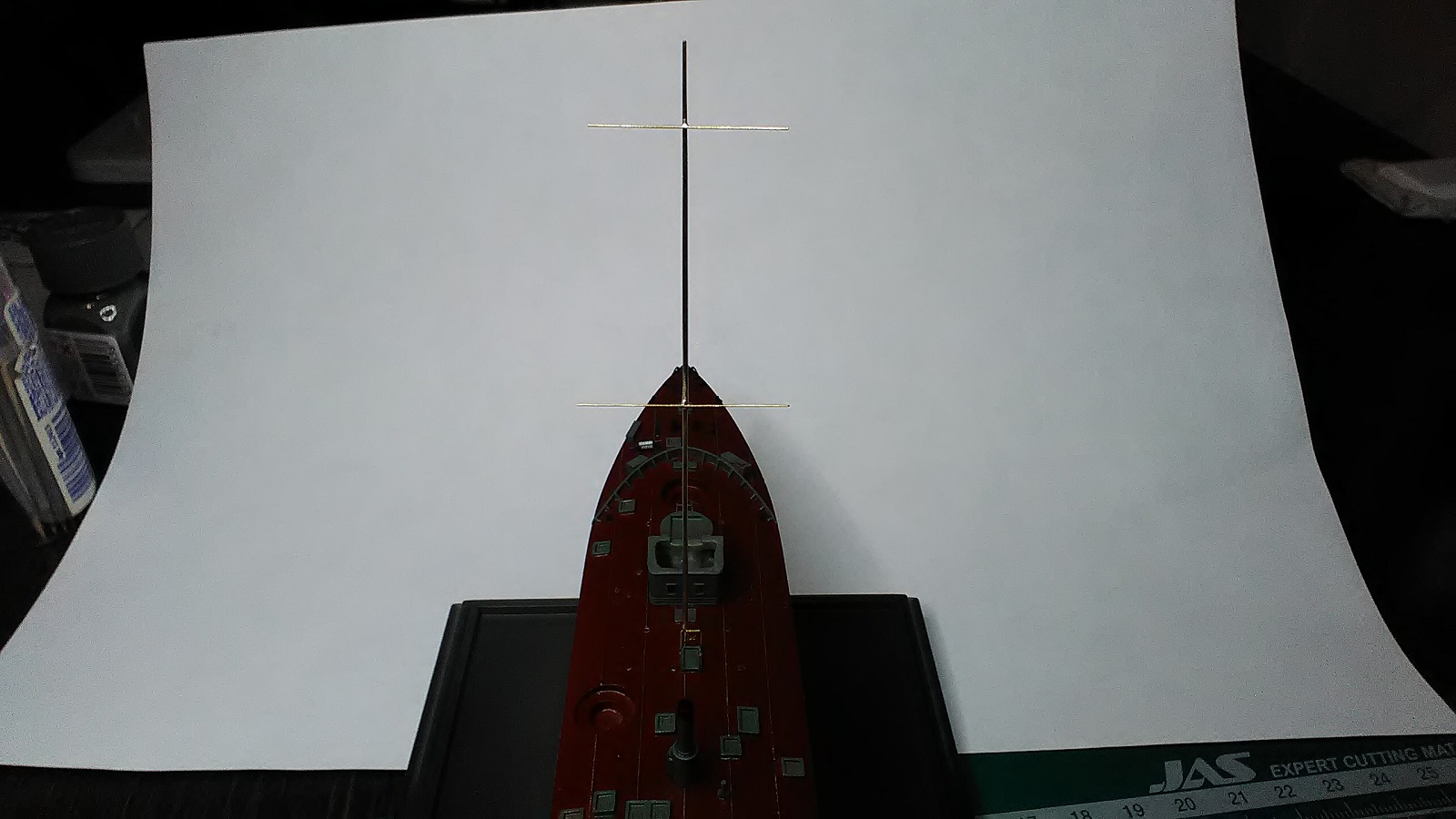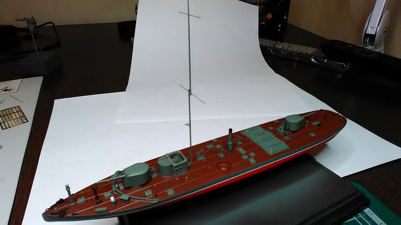 Экстренно изготовил мачту, нарастил мостик любимым дошираком и покрыл все матом (в хорошем смысле), поверхность стала на вид совсем гладкая, на макро, конечно ещё видно, но оставлю уже так.