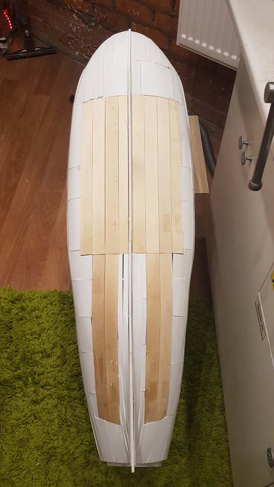 Практика показала, что при обшивке пластиком верхней части корабля, нижнюю лучше обшить деревом - больше жесткости будет. Тут показана обшивка целиковыми 30 см линейками