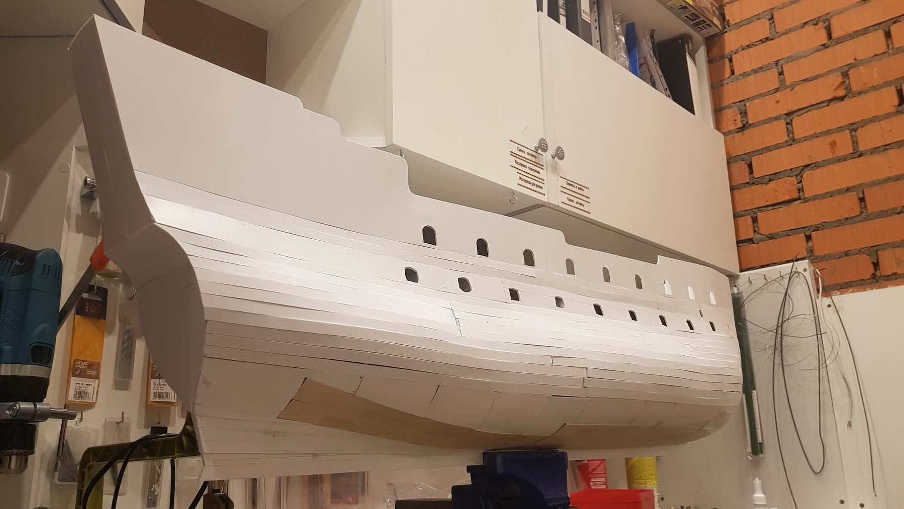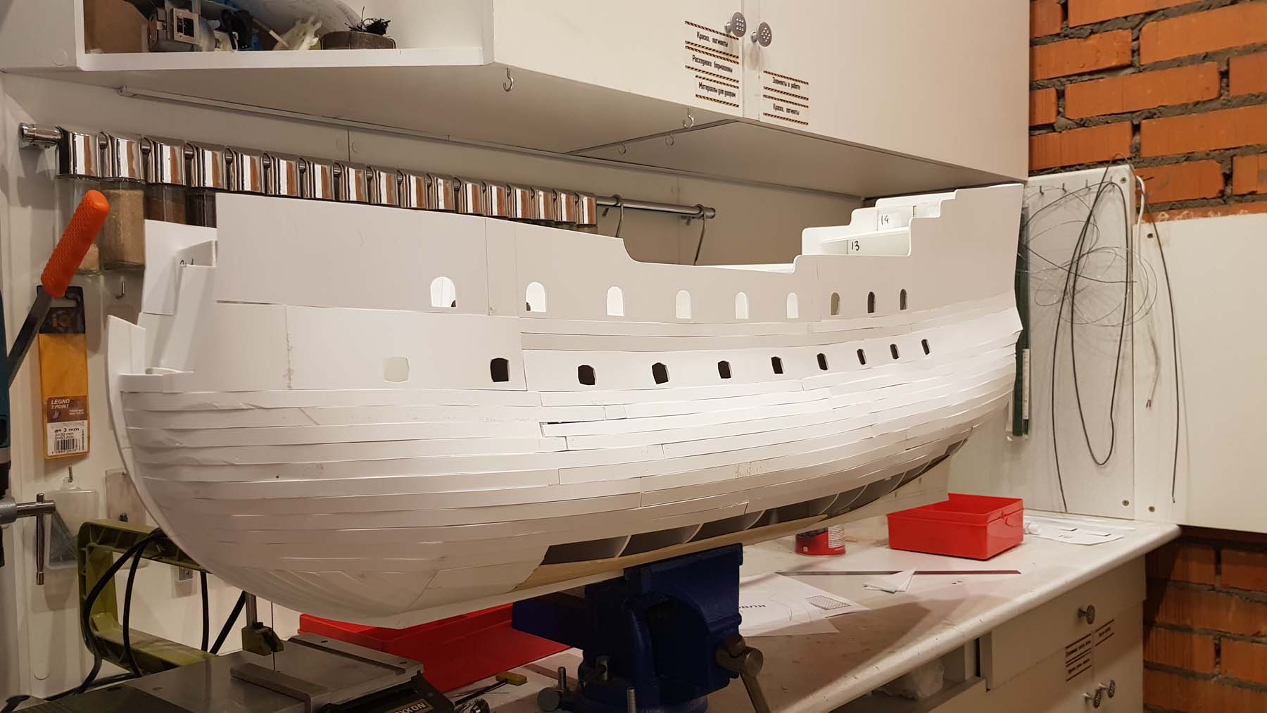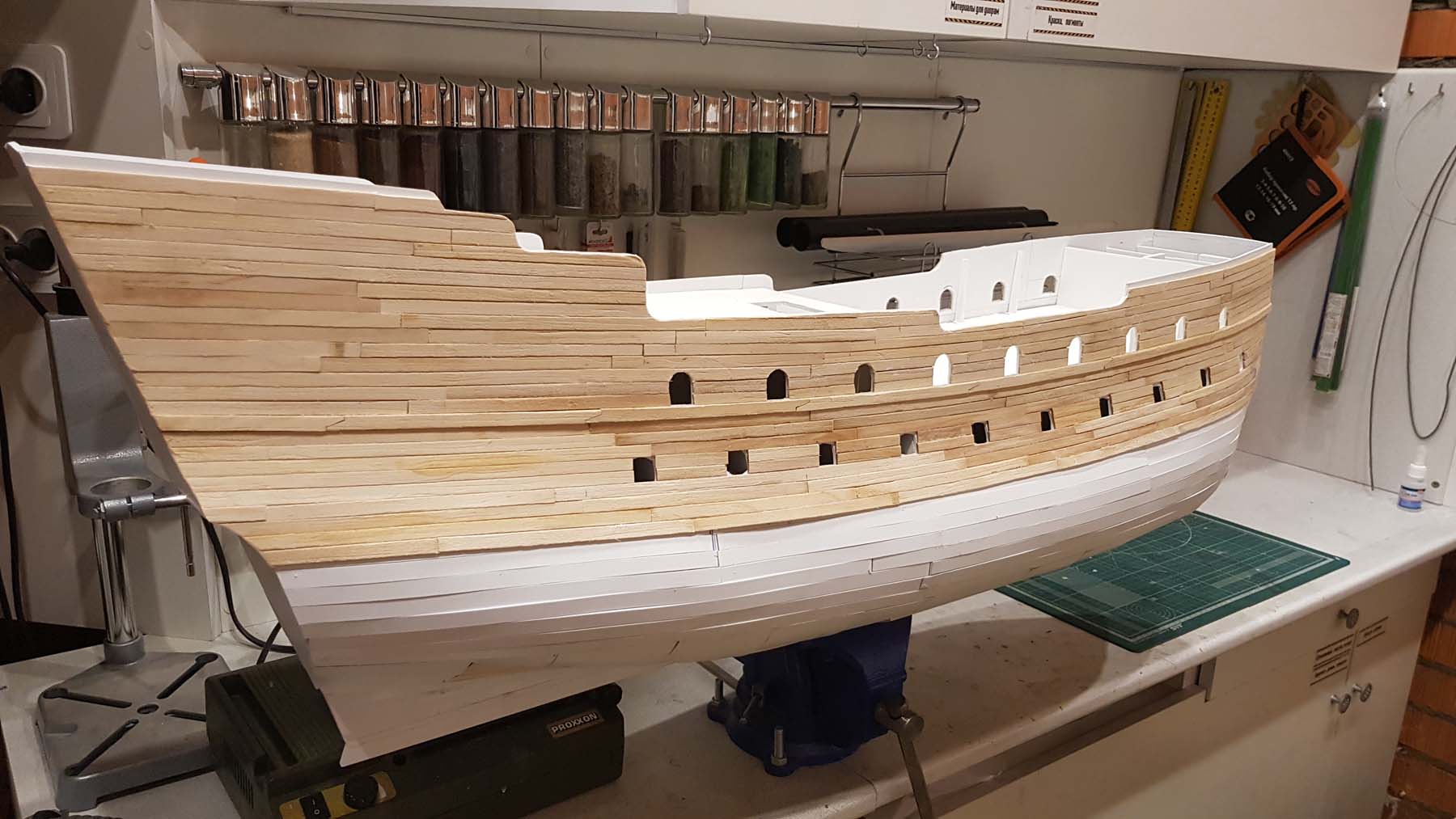 Обратите внимание: установив верхнюю часть обшивки я зачем то начал обшивать все что ниже рейками шириной 1 см. В голове где-то в глубине билась мысль: "как же я пушечные порты нижней палубы делать таким образом буду?", но я ее глушил. И тут осенило, что я сам свой план работ забыл. Ниже первого слоя идет второй с пушечными портами нижней палубы. Тоже большие детали. Пришлось их корректировать под то, что я уже налепил