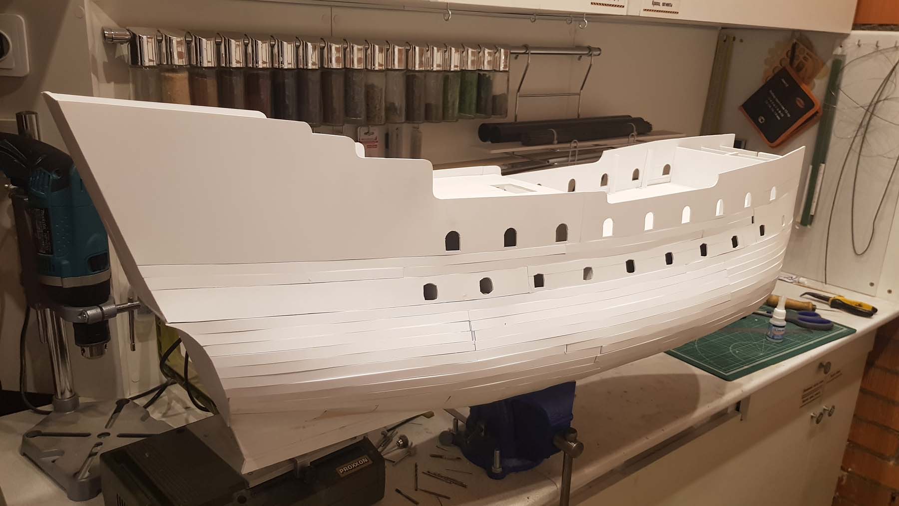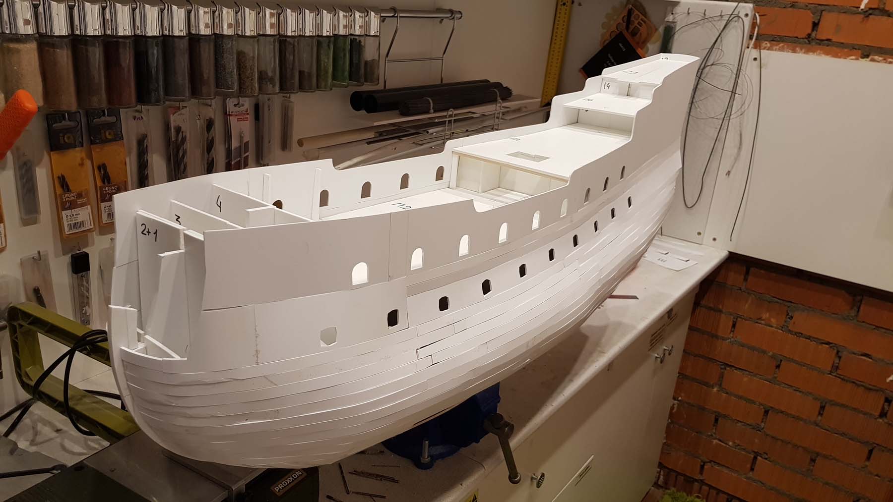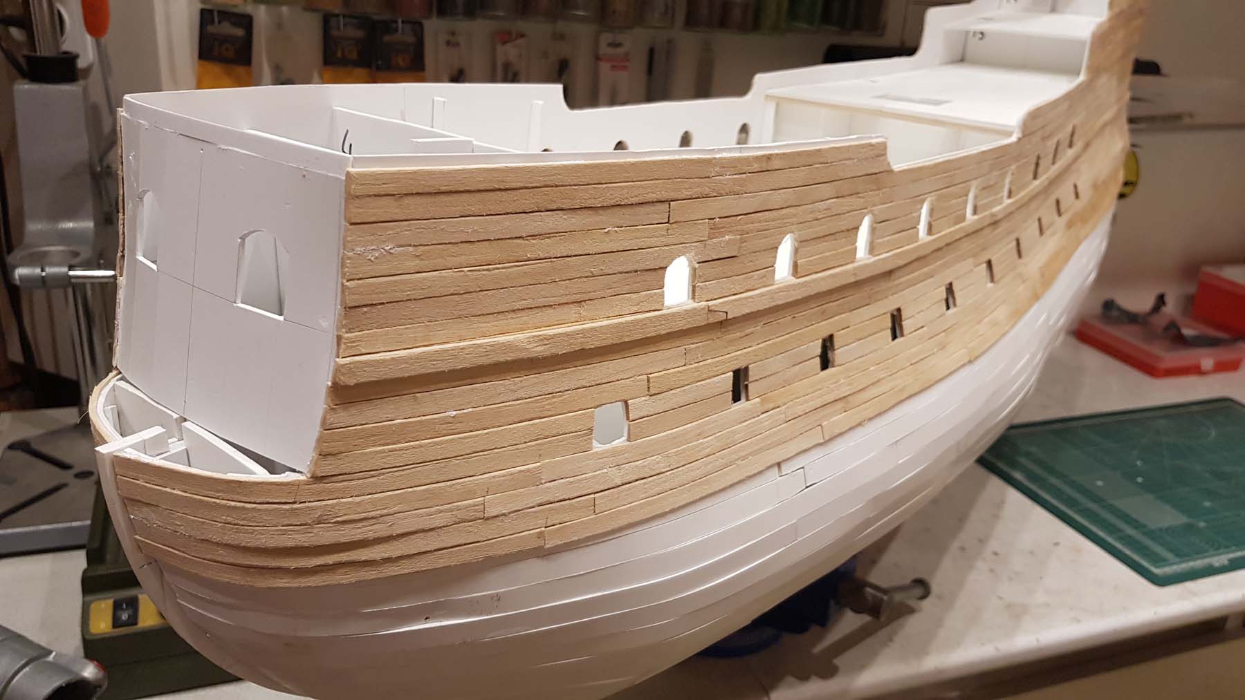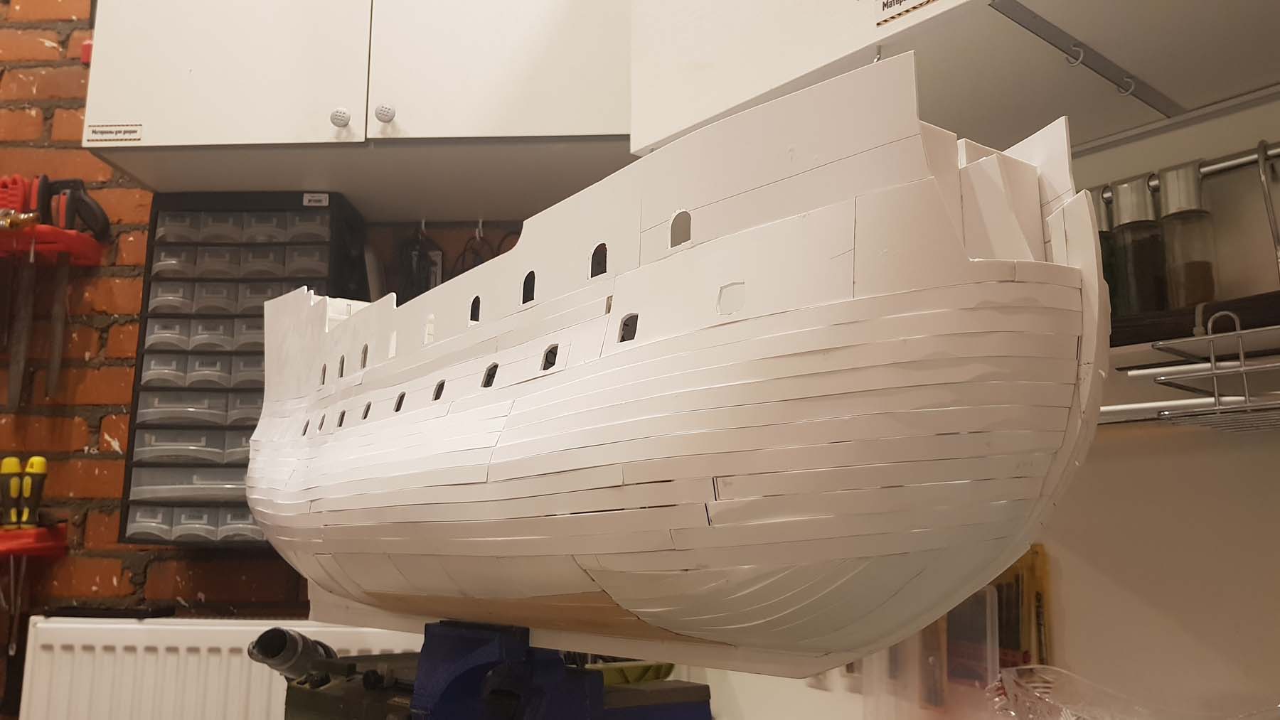 Обратите внимание: установив верхнюю часть обшивки я зачем то начал обшивать все что ниже рейками шириной 1 см. В голове где-то в глубине билась мысль: "как же я пушечные порты нижней палубы делать таким образом буду?", но я ее глушил. И тут осенило, что я сам свой план работ забыл. Ниже первого слоя идет второй с пушечными портами нижней палубы. Тоже большие детали. Пришлось их корректировать под то, что я уже налепил
