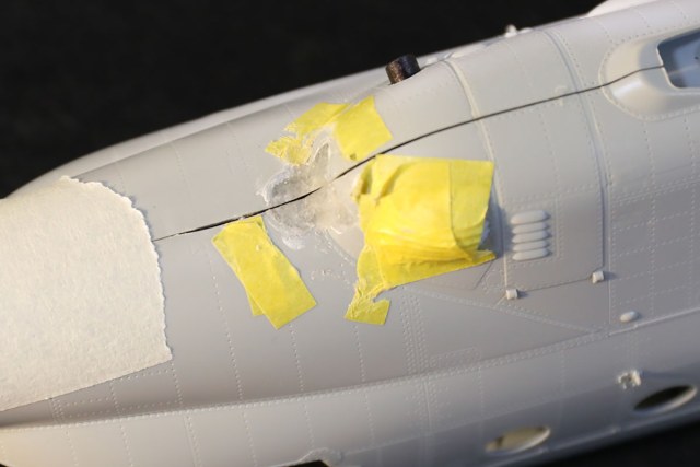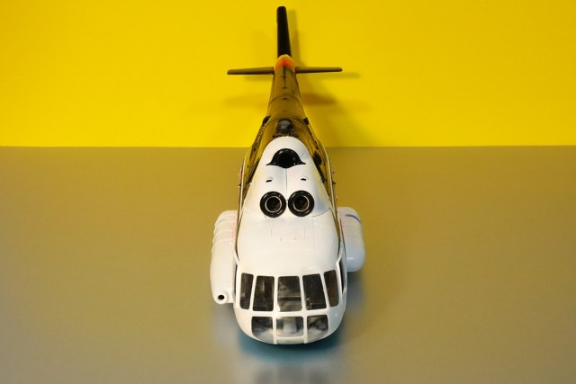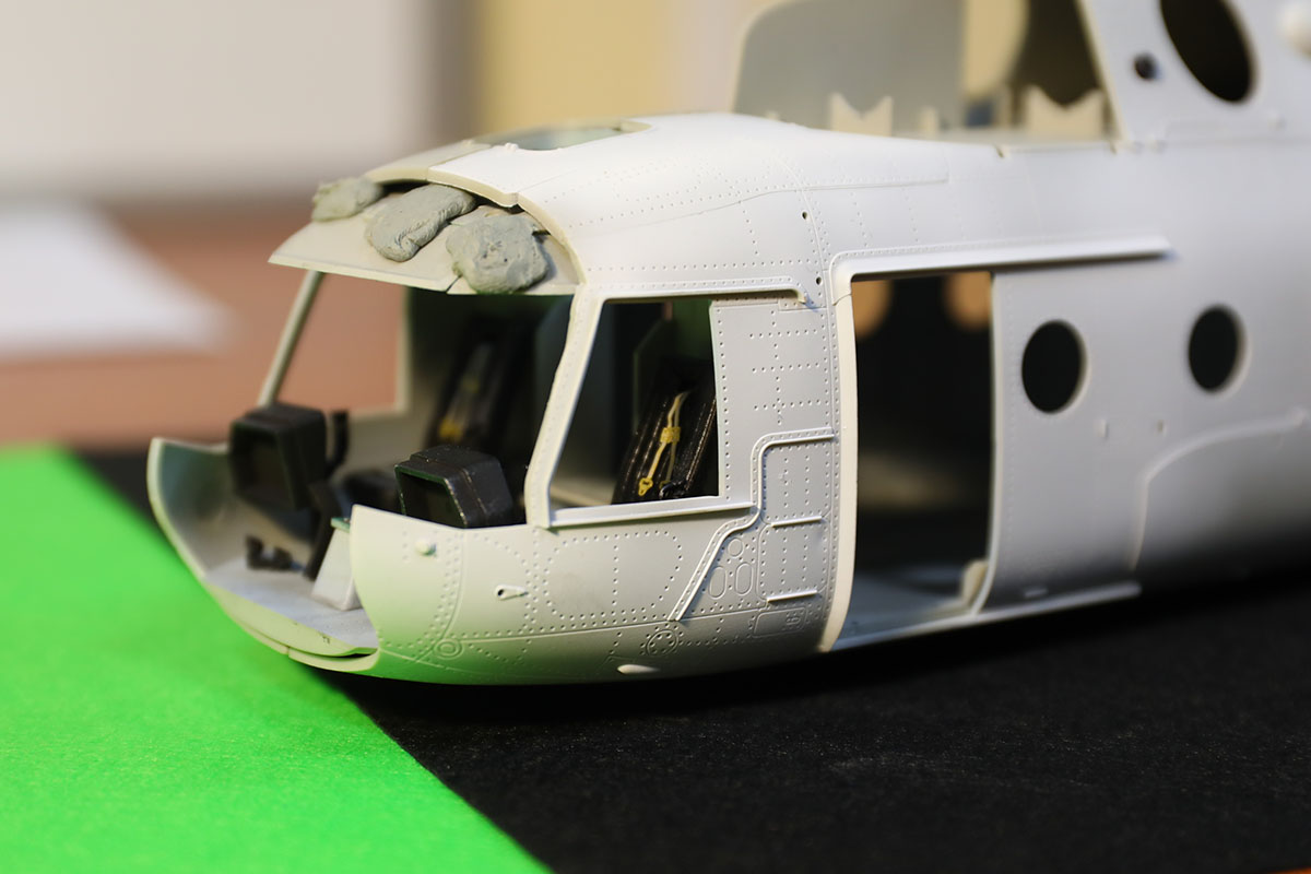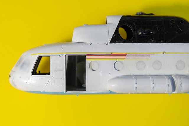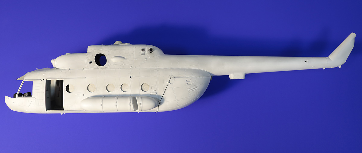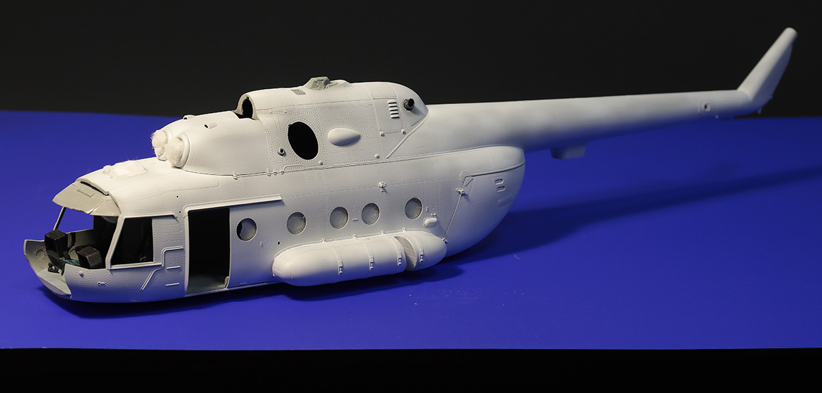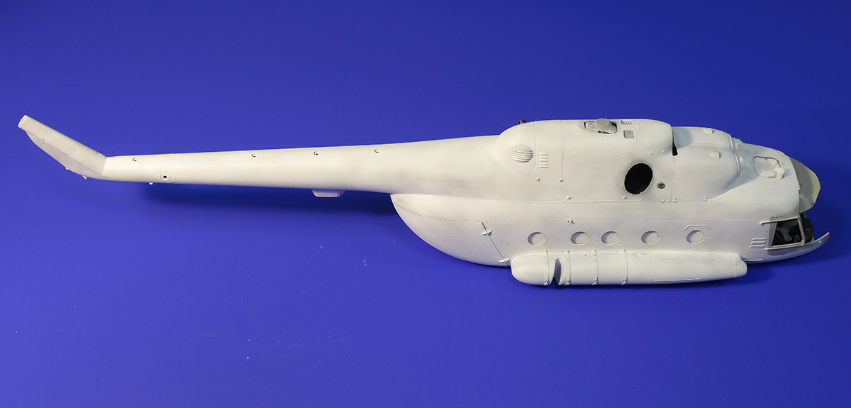Вертушка доолго стояла на полке, но на днях добрался до неё, завершил вышкуривание швов, приклеил топливные баки, подогнал капоты, створки грузового отсека и загрунтовал.