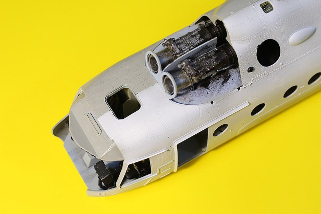 Также не буду делать смывку по фюзеляжу, либо сделаю цветом на пару тонов темнее того, в который окрашен конкретный участок модели. Расшивка и клёп очень глубокие, если по белому смыть черным, то вертолёт будет как расстрелянный.