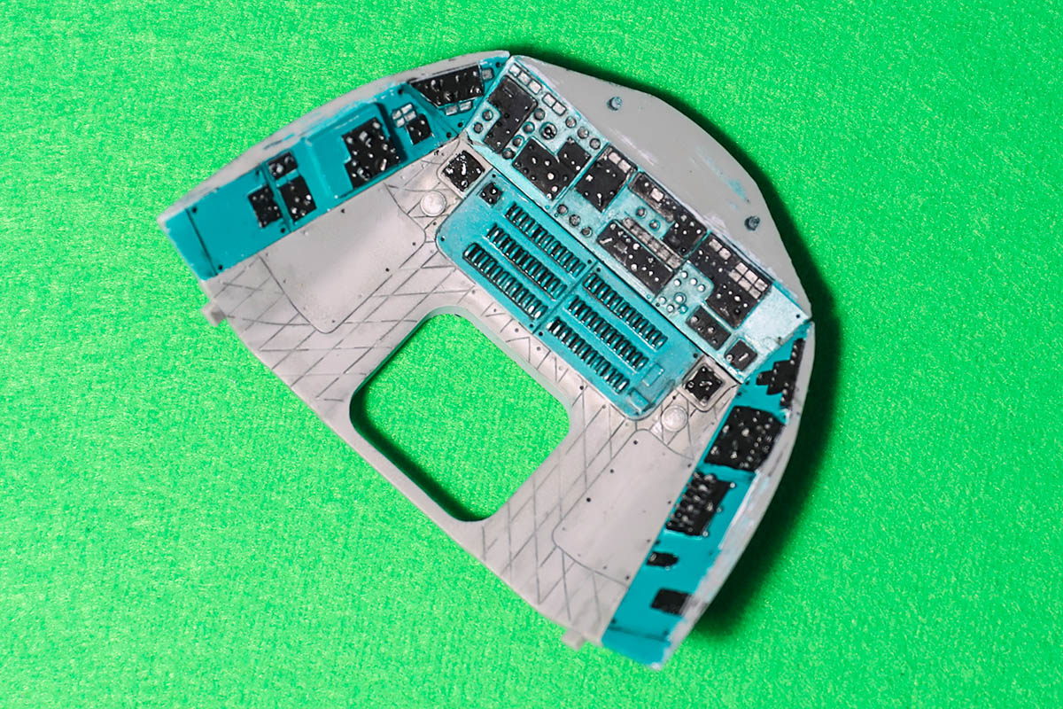 Потолок. Ещё буду доводить, хотел попробовать хитрость - слой белой краски, потом маски, чтобы открасить черные панели, потом наоборот - зеленые. Хотел по черной краске процарапать до белой в тех местах, где надписи и всякое такое вот, но с масками не очень получилось и этот потолок будет не особо видно. Да и одно дело на фото во весь экран, другое - с расстояния и вживую, когда всё гораздо мельче. Подправлю косяки, подкрашу желтые и красные индикаторы и хватит.