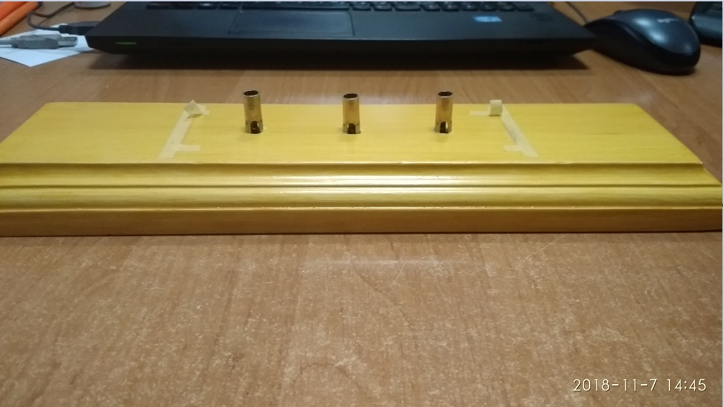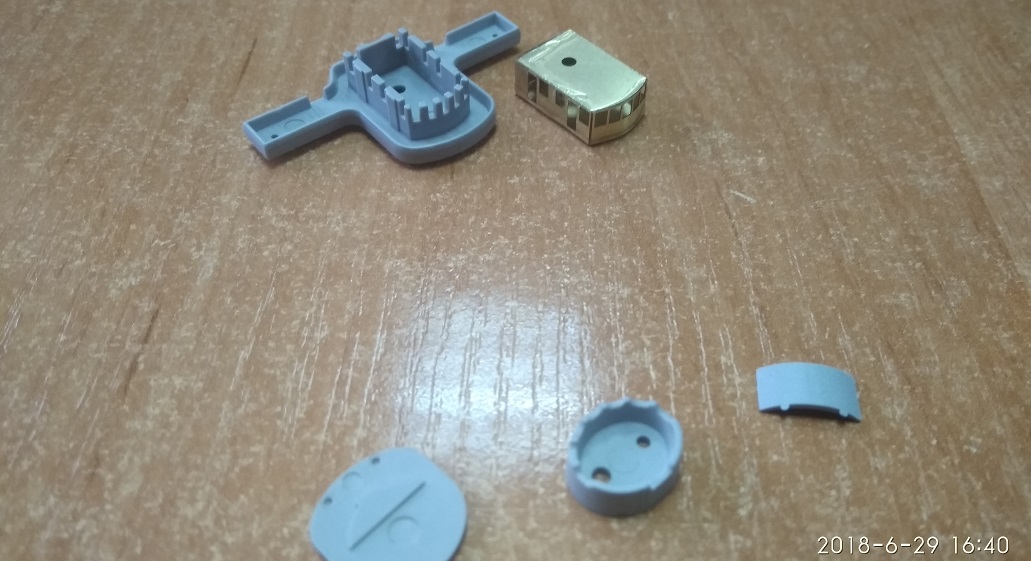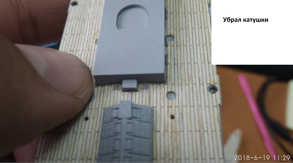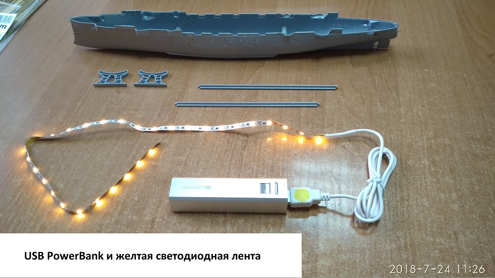 Поскольку заказал подсветку usb с ebay, то половинки днища я склеить и красить не мог, соответственно, начал с примерки деревянной палубы, чтобы она встало на место, удалил катушки для пожарных рукавов, так как они идут в травлении. Дальше занялся трубами. С фототравлением мой первый опыт, сначала я его отделял от литников и подтачивал удерживаемые усики пилочкой. Потом начал усики оставлять подлиньше, чтобы не гнуть травление, и отделив элемент подрезать их ножницами, так быстрее и гораздо аккуратнее и меньше шансов травление сломать. Приклеивал я травление супер клей гелем, выдавливал его чуть чуть на канцелярский гвоздик или зубочистку, действительно есть время позиционировать, удобно. В некоторых местах, где нужно скрепить два элемента травления, пробовал спаять, сначала обработав травление специальным флюсом, в принципе паяется легко, но надо очень равномерное распределение олова, аккуратно без наплывов. Паял 60 ватт паяльником, думаю нужно 40 и лопатка плоская тонкая. Супер клеем чуть проще конечно. Гнул травление, я, зажимая его в маленькие тиски. Грани на них сходятся хорошо, ровно. Поэтому довольно легко и удобно, специальные гнулки дорогие, есть много видео, как сделать гнулку самому из ножей от рубанка, но эти ножи стоят как тиски, поэтому пока купил их, а дальше видно будет. Так, закончив с трубами, взялся за ходовую рубку, она полностью сгинается из травления, пытался ее сначала спаять. Но нагревается быстро неудобно, в итоге склеил ее полностью суперклей гелем. После задумался, то ли сделать остекление, то ли сначала нужно окрасить и красить ли внутри.. Еще есть идея, поставить штурвал в рубку, так и не знаю, пока отложил, для остекления рубки думаю заказать Micro Kristal Klear. Потом подготовил площадку для установки рубки из травления, убрал пластмассовую рубку, с площадки и убрал ограждения. Дальше занялся сборкой орудийного мостика на мачту, Так вот, склеил низ из травления, сразу на обе мачты и задумался. В инструкции Эдуарда предлагается мостик полностью заменить, а у меня задумка его скомбинировать, чтобы оставить основу из пластика, наподобии как сделано в травлении от АртВокс. Мне кажется, так будет более объемнее и правдоподобнее смотреться, но основания эти по форме разные. И еще если делать из травления, так там подставки под 47-мм орудия Гочкиса, такие маленькие и сложной формы, очень сложно делать, сделал одну сначала оборачивая вокруг наконечника стержня руки, и дальше подравнивал двумя пинцетами. В общем, задумался, пока отложил этот момент. Потом мне пришли светодиодные ленты USB, одна просто желтая, другая RGB с пультом, еще заказал неоновую желтую USB метровую трубку, но недосмотрел и заказал без контроллера, теперь ждать еще контроллер долго и не факт, что понравится, наверное, поставлю просто желтую, она мне понравилась хорошо светит, не греется почти. А RGB свет желтый очень такой светлый и при включении ленты нужно каждый раз перещелкивать цвета пультом , что тоже не супер). Потом задумался о подставке, в итоге, заказал в столярном цехе из дерева. Поскольку у меня лежит следующая модель, Лайнер Титаник от Моделиста. Я взял за образец подставку от Титаника. Обошлась примерно 2$ по курсу. Поскольку с деревом еще не работал, задумался, чем ее покрыть. Собственно на этом моменте я сейчас.