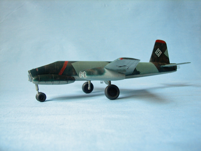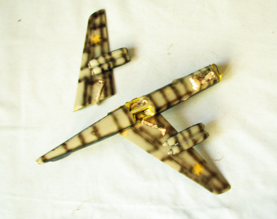 змейками. Не понравилось, очень пестрая, терялись очертания. Перекрасил с добавлением коричневых пятен, красной полосой позади кабины, тоже не очень нравилось. Несколько лет назад модель упала и отломалось крыло и стабилизатор, шасси, рас-