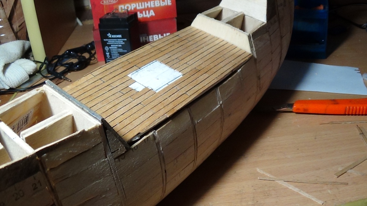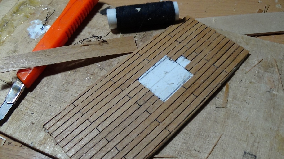 @Евгений Туснин написал:Выставляю на Ваш суд главную палубу сделанную из 6-и слоев ватмана проклеенного ПВА на горячее утюгом....Доски палубы из шпона и наклеивались с прокладыванием черной нити между ними...