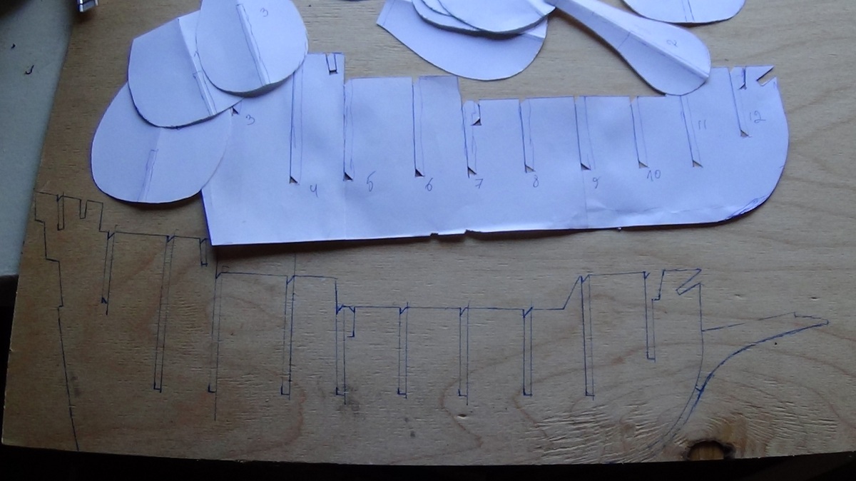 Здравствуйте Всем ! После непродолжительного перерыва продолжаю отчет о стройке....На днях решил сделать шаблон фальшборта с нижними отсеками и разметками портов и фендерсов... Выкройку брал с МАЛИ МОДЕЛАР-Бумажный ЦМОК. Потратив часа 2 на срисовку шаблона с монитора компа-влияет отсутствие принтера-с последующей прорисовкой обнаружил несовпадение палуб на шаблоне и на модели...После внимательного просмотра файлов бумажного ЦМОКа обнаружил что он 3 -мачтовый ! И тогда решил что вначале настелю палубы и уже по ним буду делать шаблон фальшборта...Выставляю на Ваш суд главную палубу сделанную из 6-и слоев ватмана проклеенного ПВА на горячее утюгом....Доски палубы из шпона и наклеивались с прокладыванием черной нити между ними....