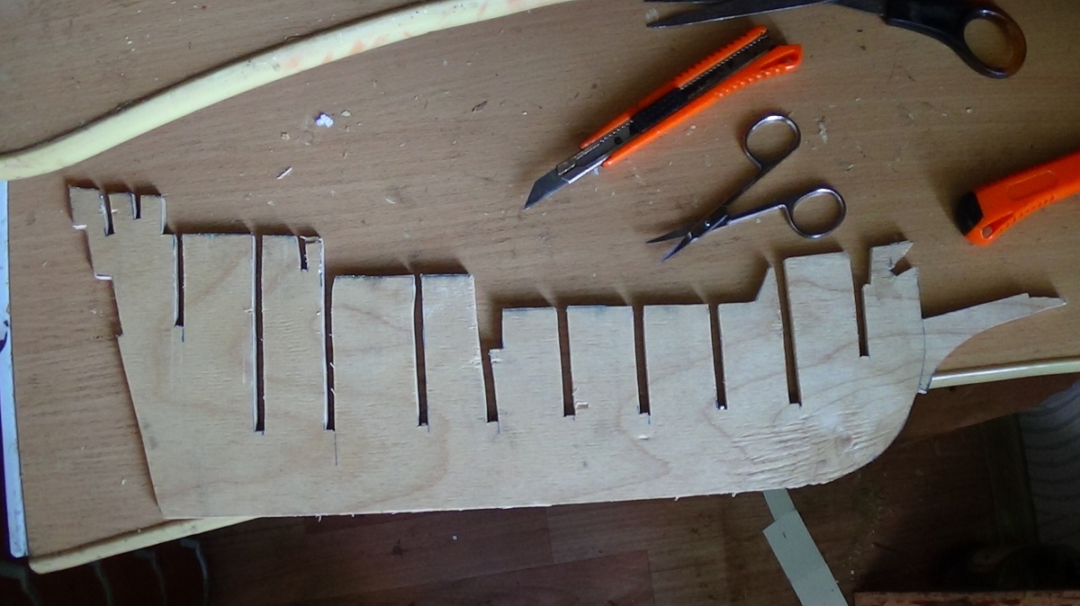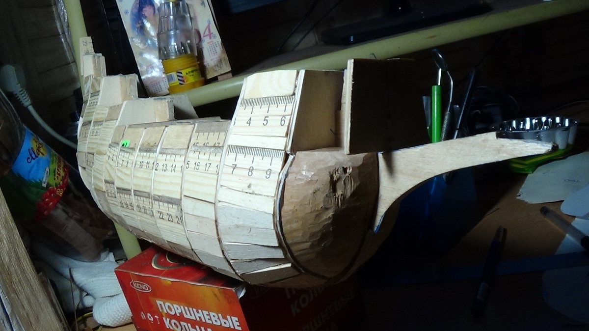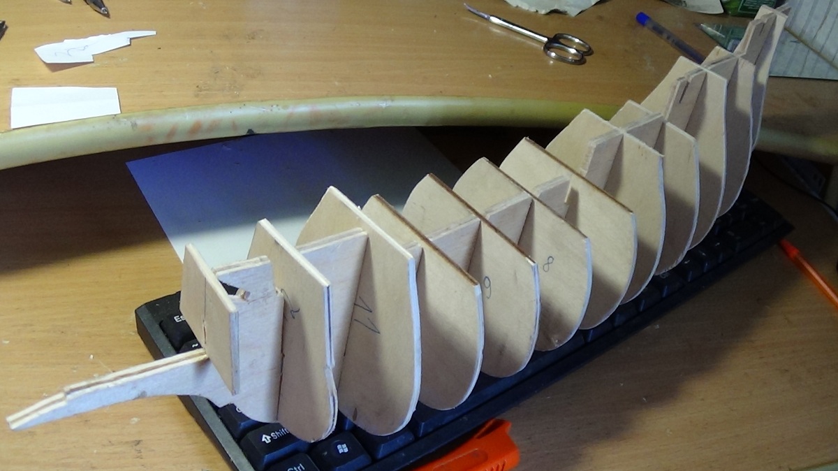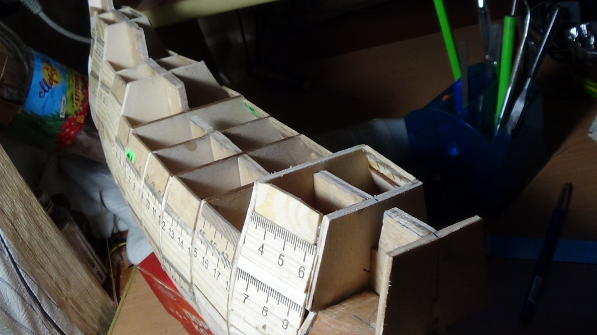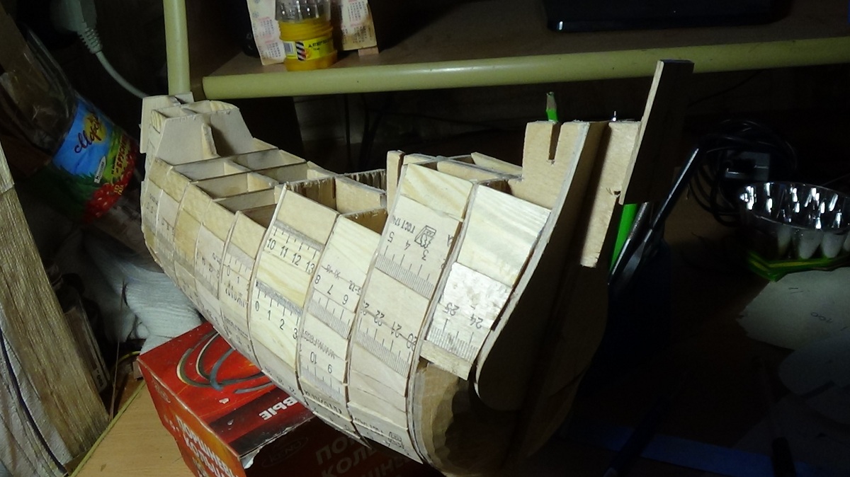 Добрый вечер !На этой модели решил испробовать новый для себя способ сборки корпуса -Шпации между шпангоутами заполняются отрезками дерева- здесь линейки....Мне кажется что должно получится хорошо .